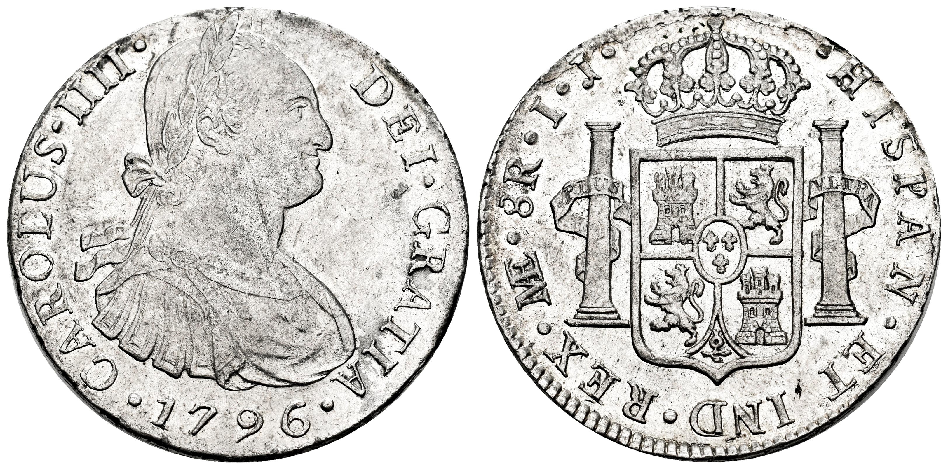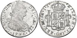 Carlos IV (1788-1808). 8 reales. 1796. Lima. IJ. (Cal-913). Ag. 26,62 g. Leves rayitas en el anverso. Brillo original, sobre todo en el reverso. EBC-/EBC. Est...250,00.