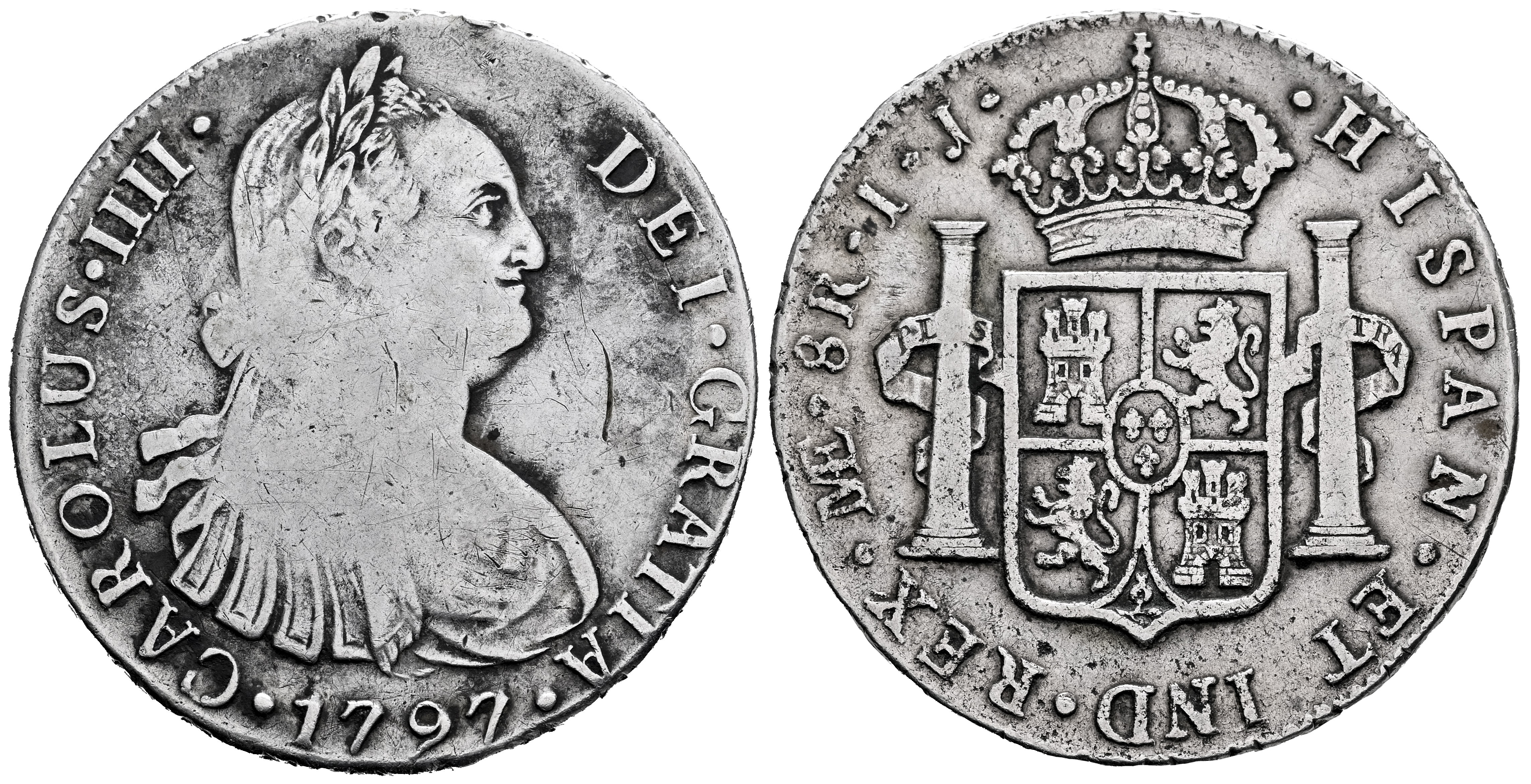 Carlos IV (1788-1808). 8 reales. 1797. Lima. IJ. (Cal-915). Ag. 26,47 g. Golpe en canto. Rayas en anverso. Limpiada. BC+. Est...70,00.