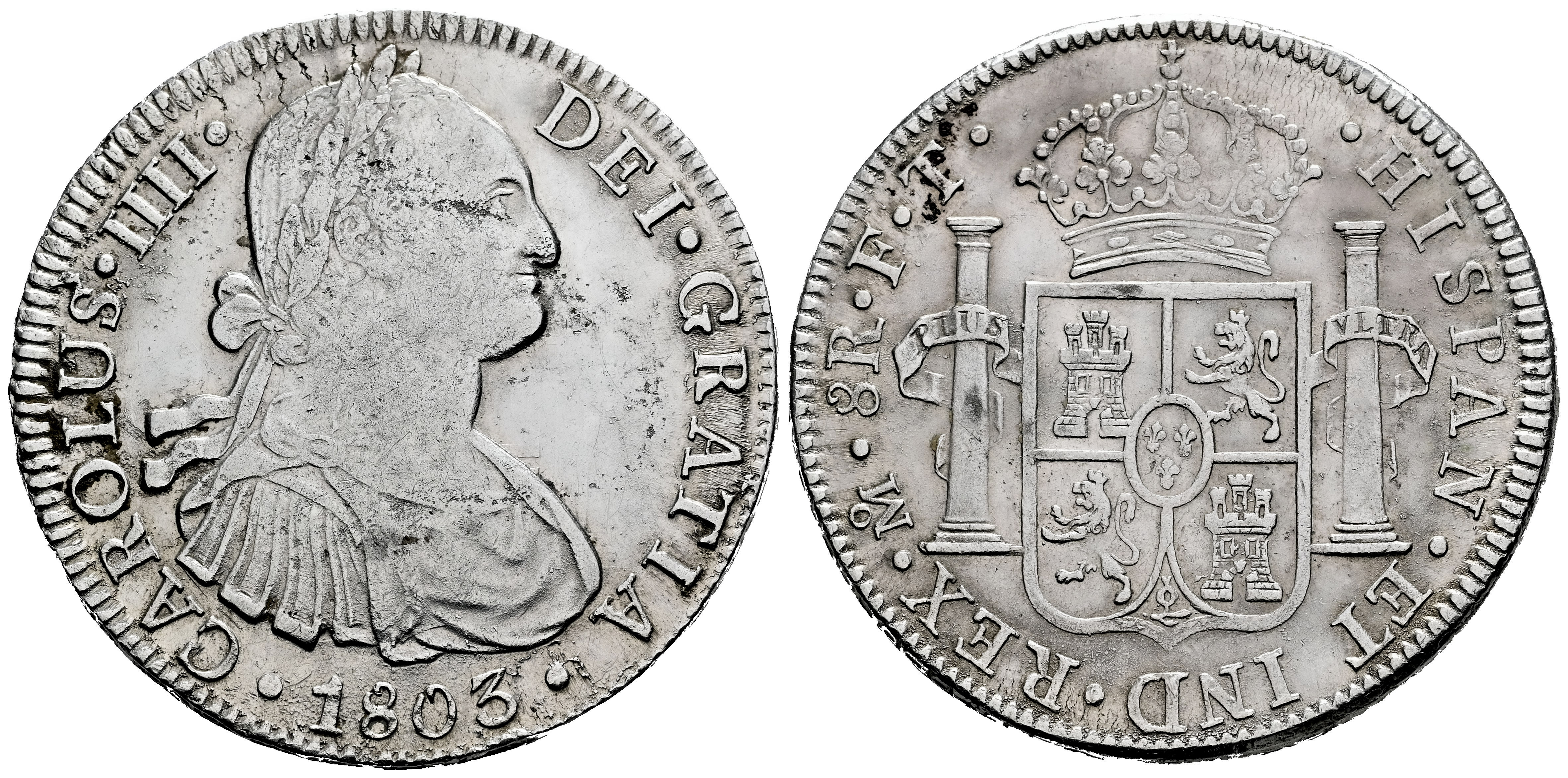 Carlos IV (1788-1808). 8 reales. 1803. México. FT. (Cal-977). Ag. 26,96 g. Limpiada. MBC+. Est...120,00.