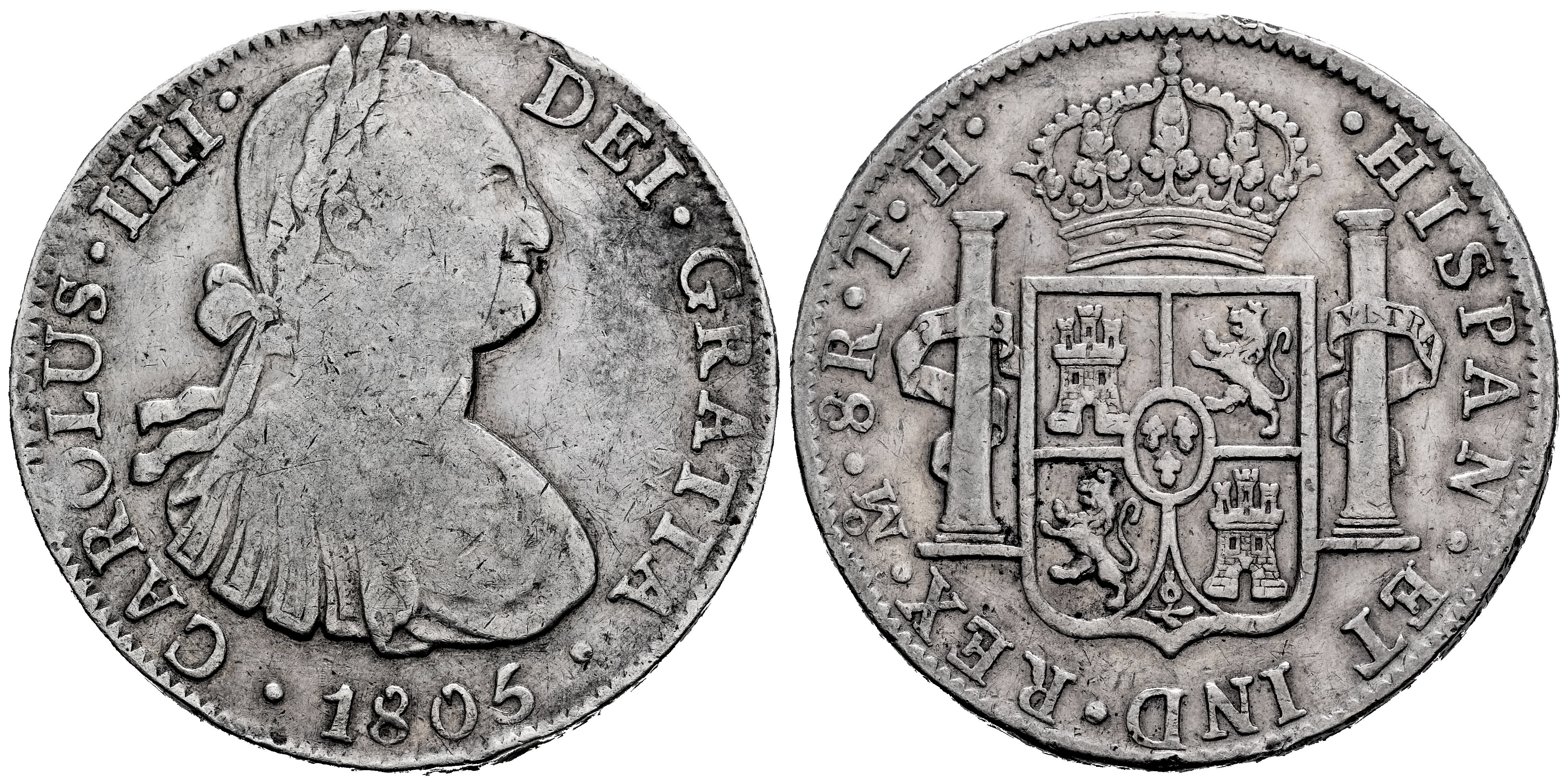 Carlos IV (1788-1808). 8 reales. 1805. México. TH. (Cal-983). Ag. 26,68 g. MBC-. Est...90,00.