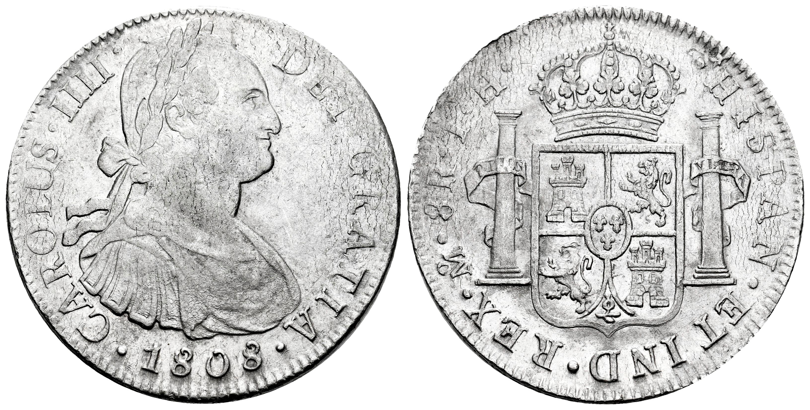 Carlos IV (1788-1808). 8 reales. 1808. México. TH. (Cal-988). Ag. Plata ligeramente agria. Brillo original, sobre todo en reverso. MBC+/EBC-. Est...180,00.