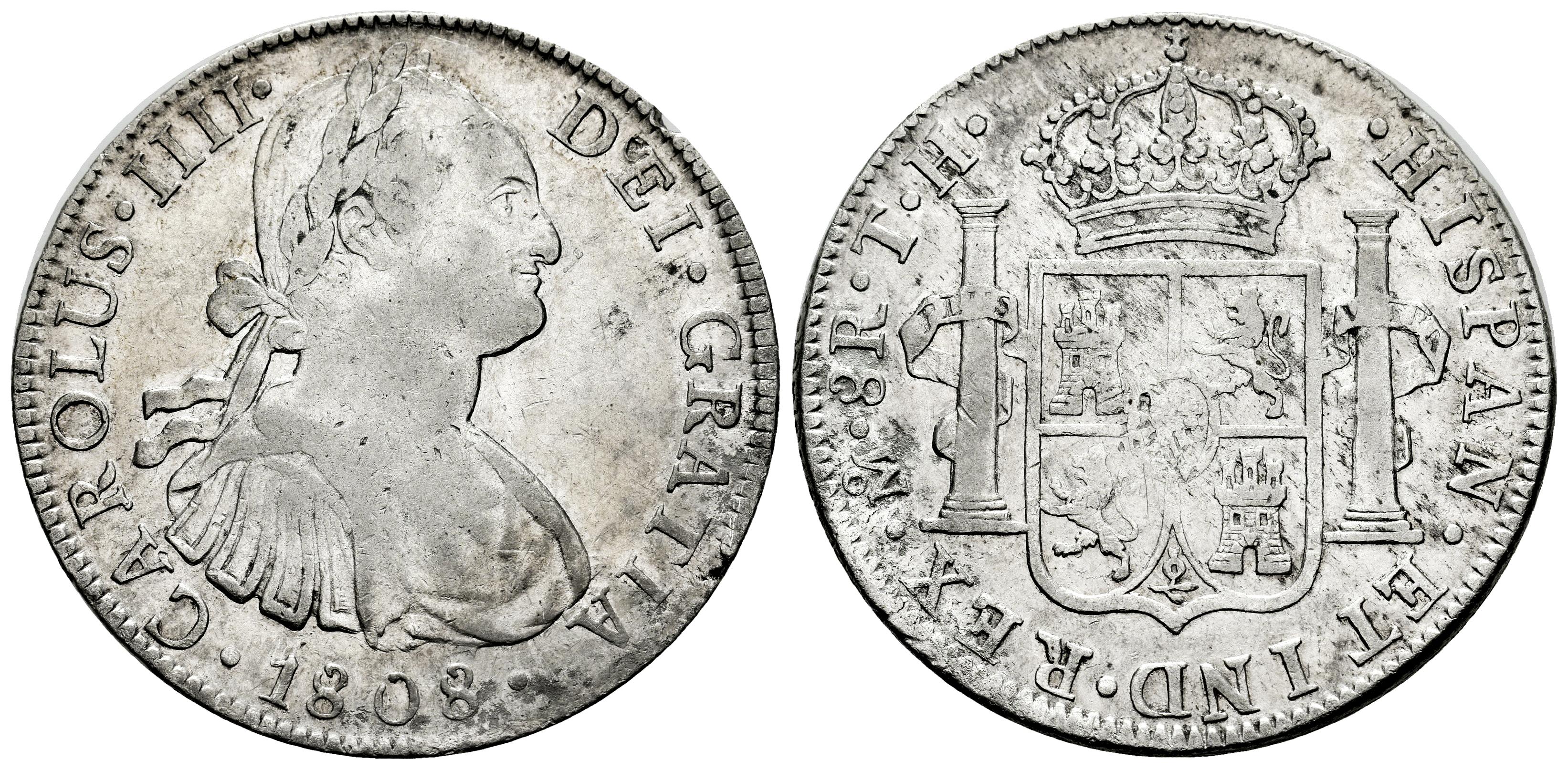 Carlos IV (1788-1808). 8 reales. 1808. México. TH. (Cal-988). Ag. 26,87 g. Golpes en el canto. MBC-. Est...90,00.