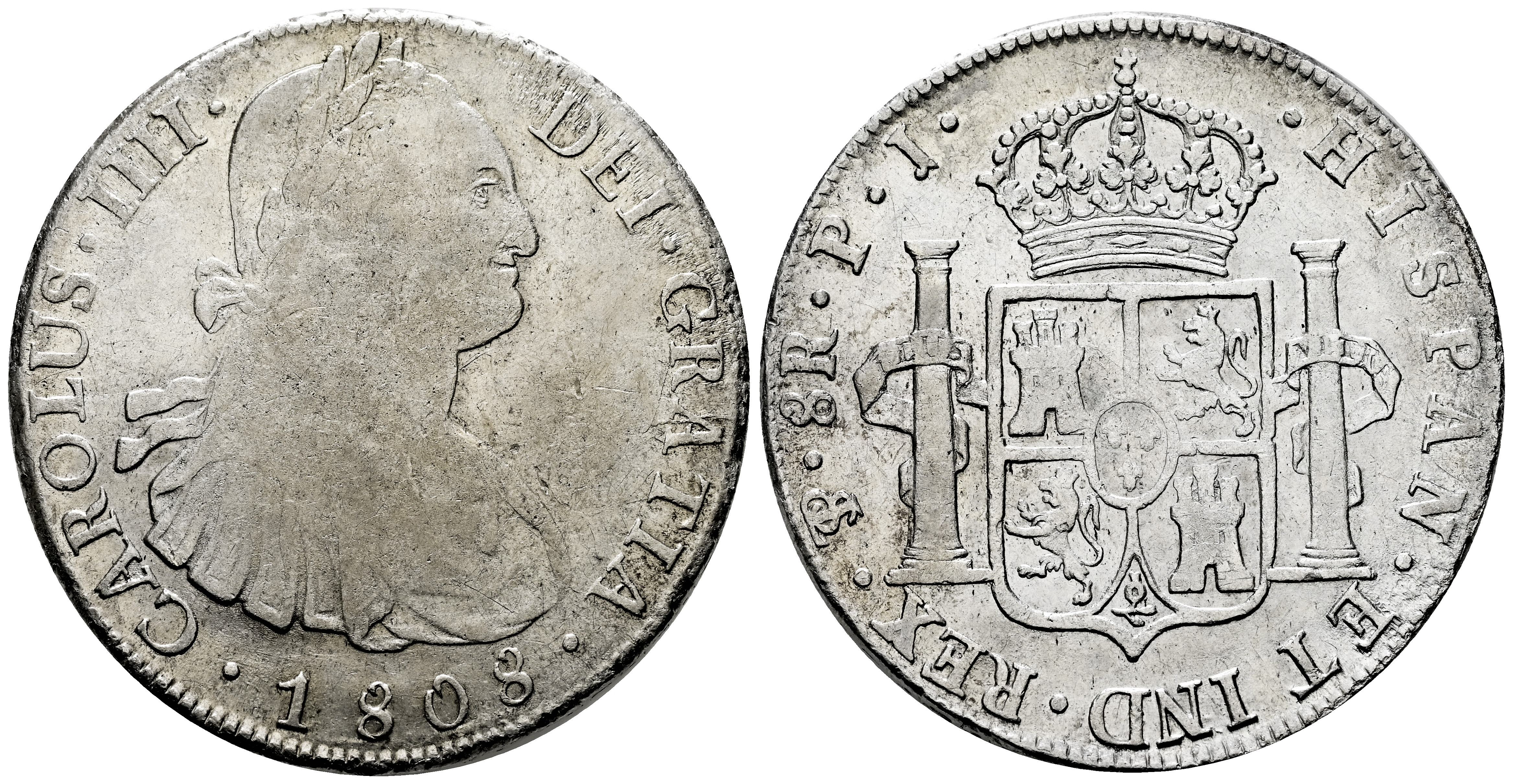 Carlos IV (1788-1808). 8 reales. 1808. Potosí. PJ. (Cal-1014). Ag. 26,75 g. Acuñación floja. BC+/MBC+. Est...100,00.