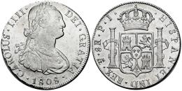 Carlos IV (1788-1808). 8 reales. 1808. Potosí. PJ. (Cal-1014). Ag. 26,96 g. Suaves rayitas. Limpiada. MBC+. Est...120,00.
