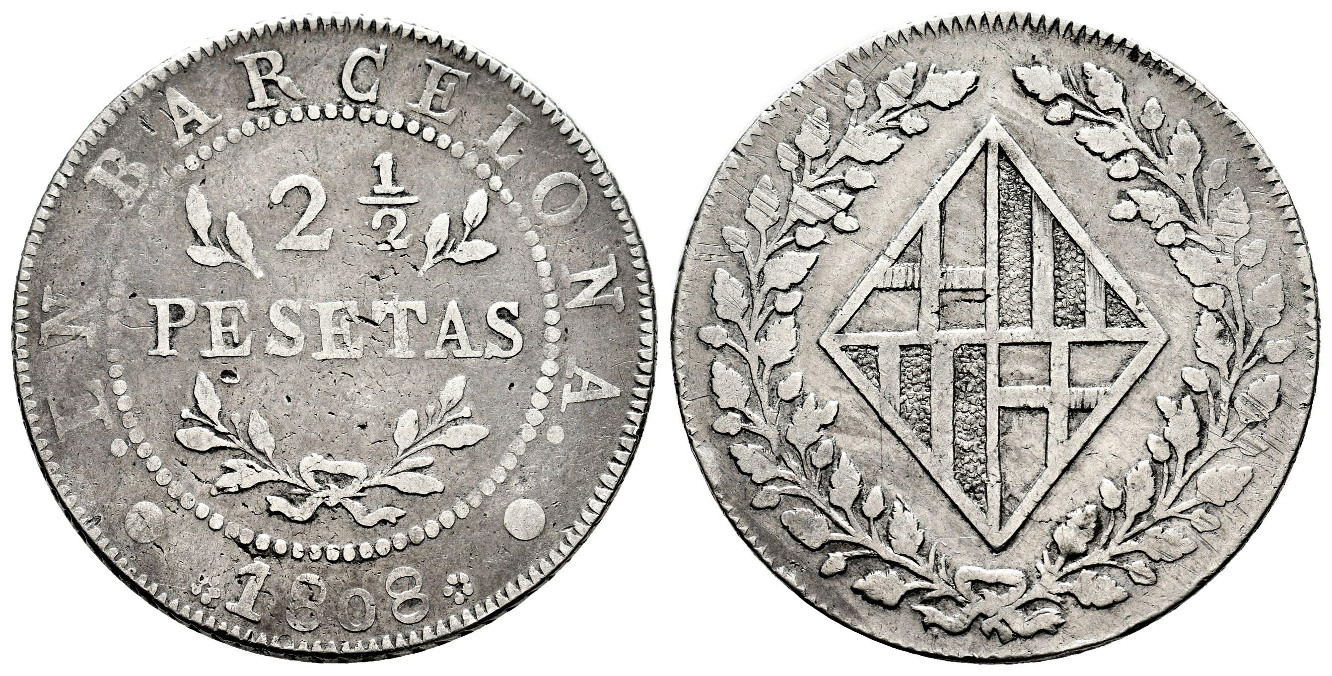 José Napoleón (1808-1814). 2 1/2 pesetas. 1808. Barcelona. (Cal-40). Ag. 13,38 g. Rayitas de ajuste y marquitas. Escasa. MBC-. Est...250,00.