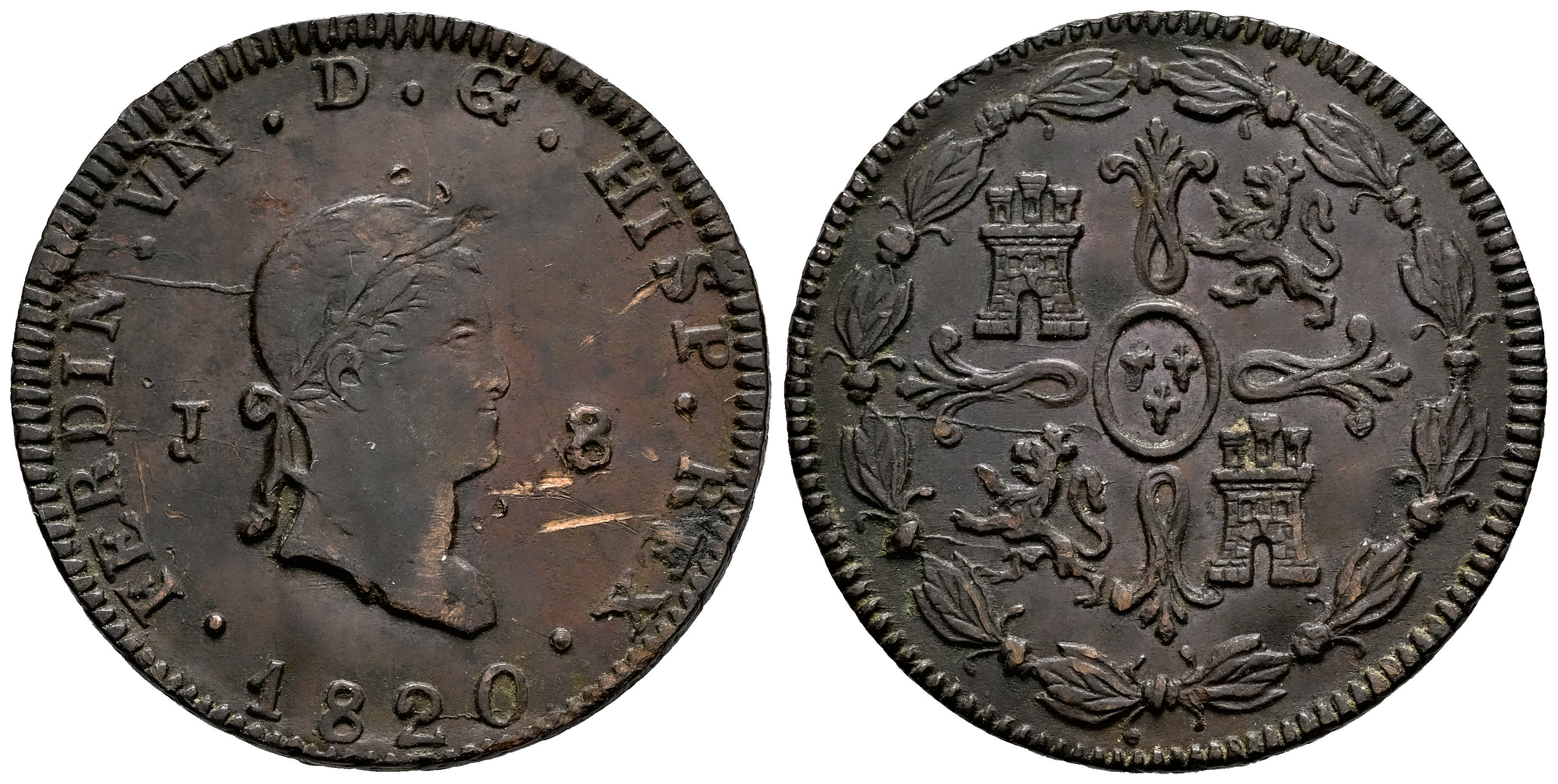Fernando VII (1808-1833). 8 maravedís. 1820. Jubia. (Cal-200). Ae. 9,37 g. Rayas en anverso. MBC/MBC+. Est...50,00.