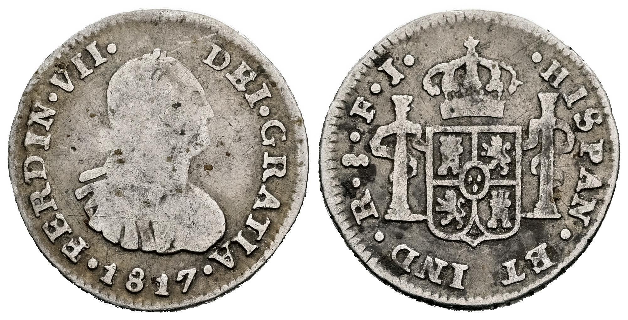 Fernando VII (1808-1833). 1/2 real. 1817. Santiago. FJ. (Cal-462). Ag. 1,55 g. Busto de Carlos IV. Escasa. BC. Est...60,00.