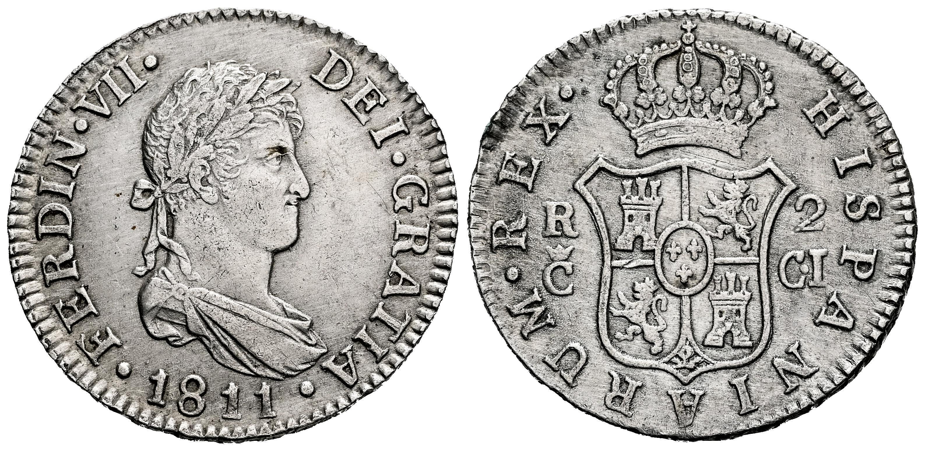 Fernando VII (1808-1833). 2 reales. 1811. Cádiz. CI. (Cal-726). Ag. 5,77 g. Marca de ceca grande. Ligeramente limpiada. MBC+. Est...100,00.