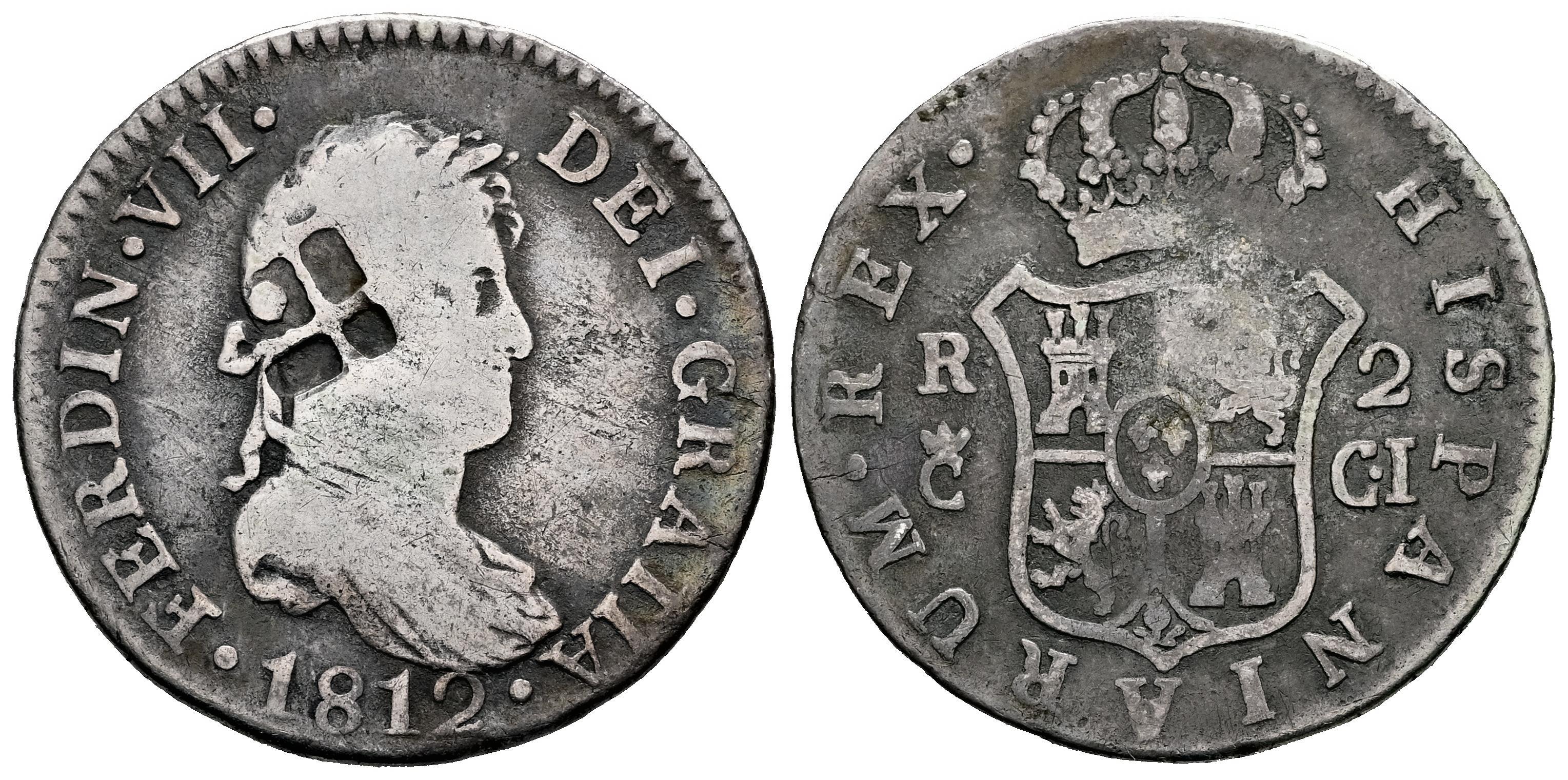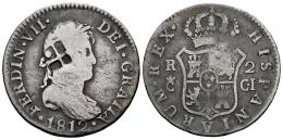 Fernando VII (1808-1833). 2 reales. 1812. Cádiz. CI. (Cal-727). Ag. 5,53 g. Ceca grande. Resello de Vique (Cuba). BC+. Est...45,00.