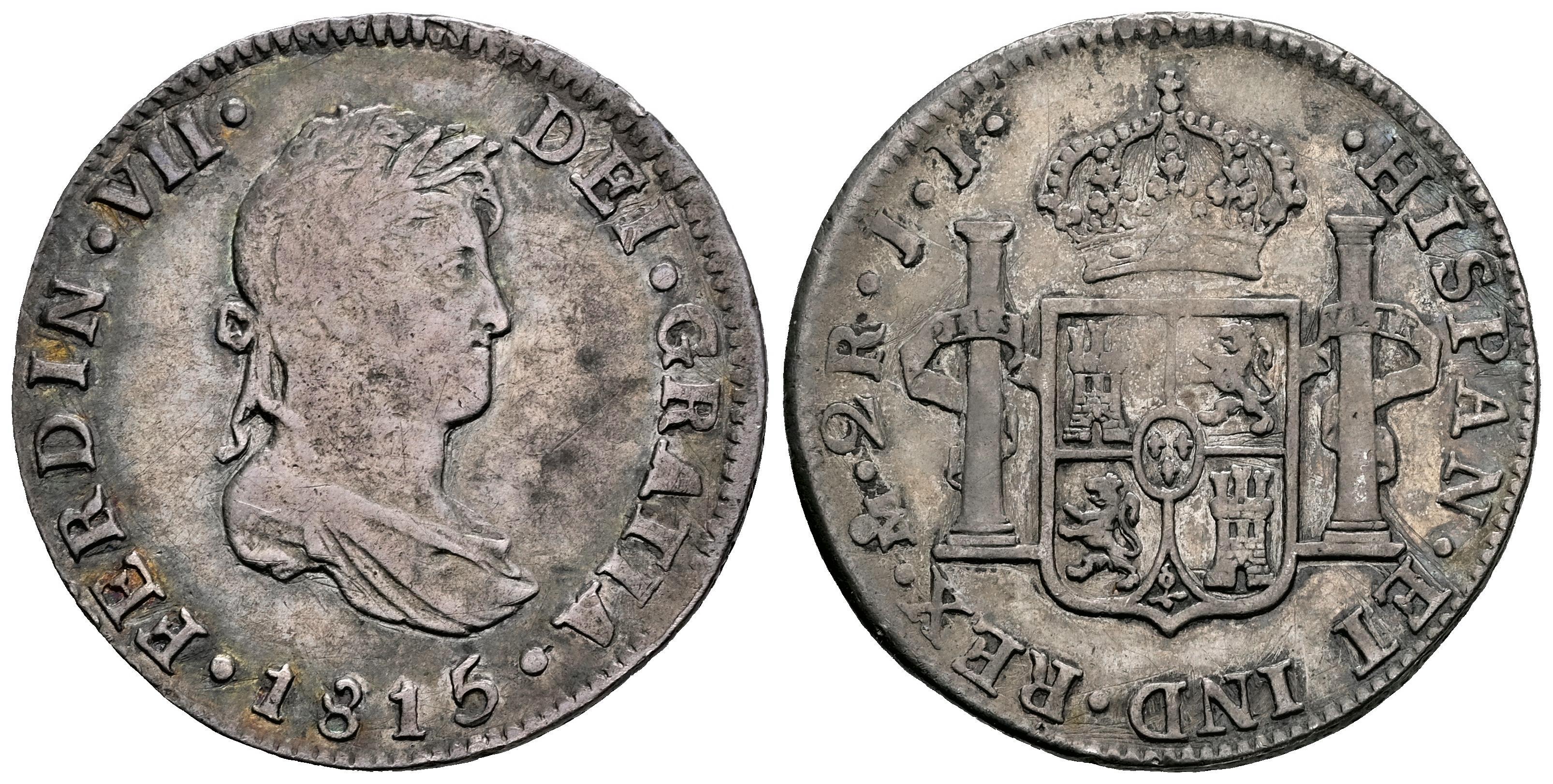 Fernando VII (1808-1833). 2 reales. 1815. México. JJ. (Cal-872). Ag. 6,65 g. Suave pátina con ligero tono. Múltiples rayas. MBC. Est...50,00.