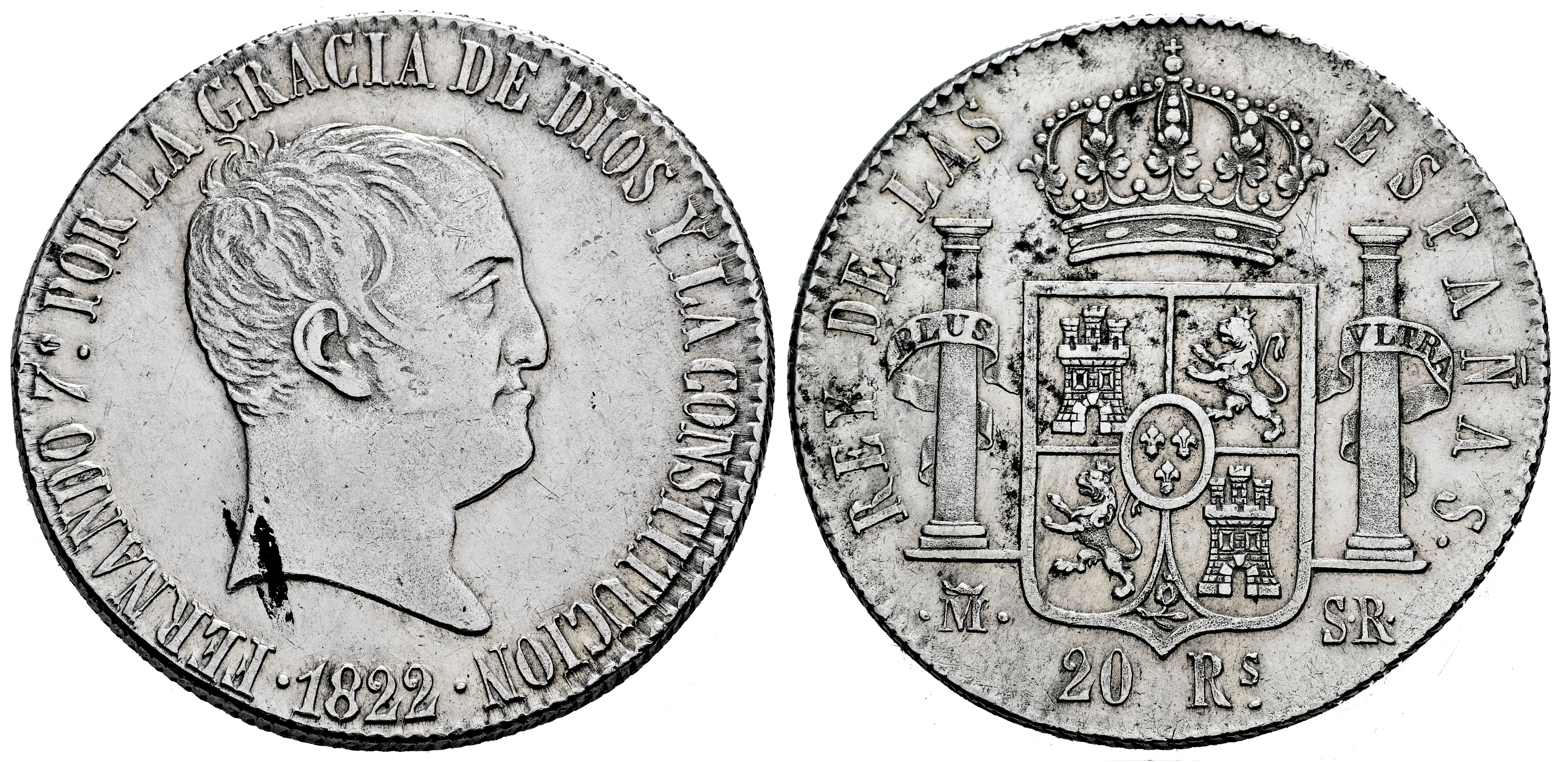 Fernando VII (1808-1833). 20 reales. 1822. Madrid. SR. (Cal-1282). Ag. 26,97 g. Tipo "Cabezón". Limpiada. Pequeñas oxidaciones. MBC+. Est...300,00.