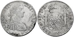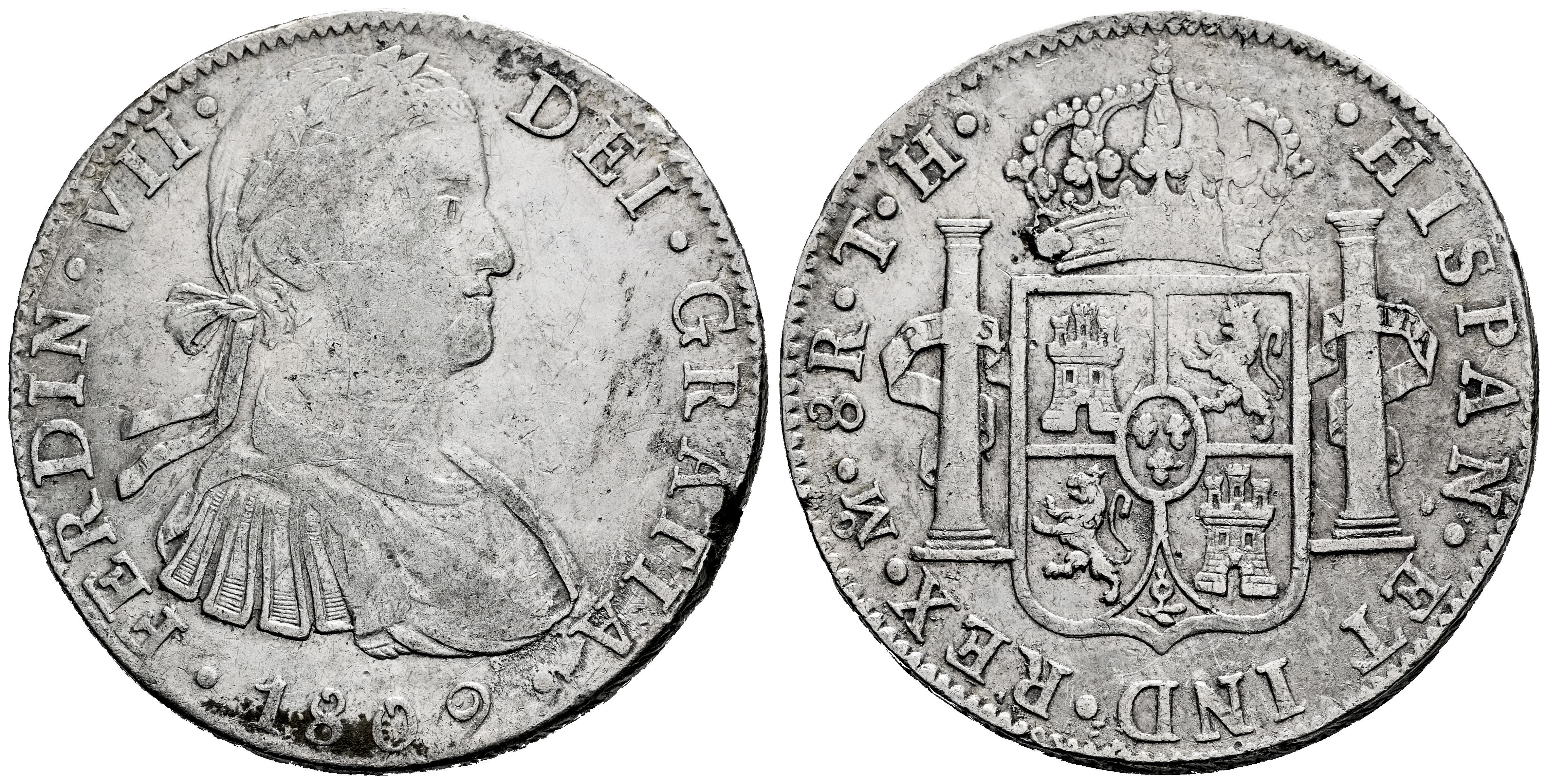 Fernando VII (1808-1833). 8 reales. 1809. México. TH. (Cal-1308). Ag. 26,87 g. Busto imaginario. Leves rayas y oxidaciones superficiales. MBC-/MBC. Est...100,00.