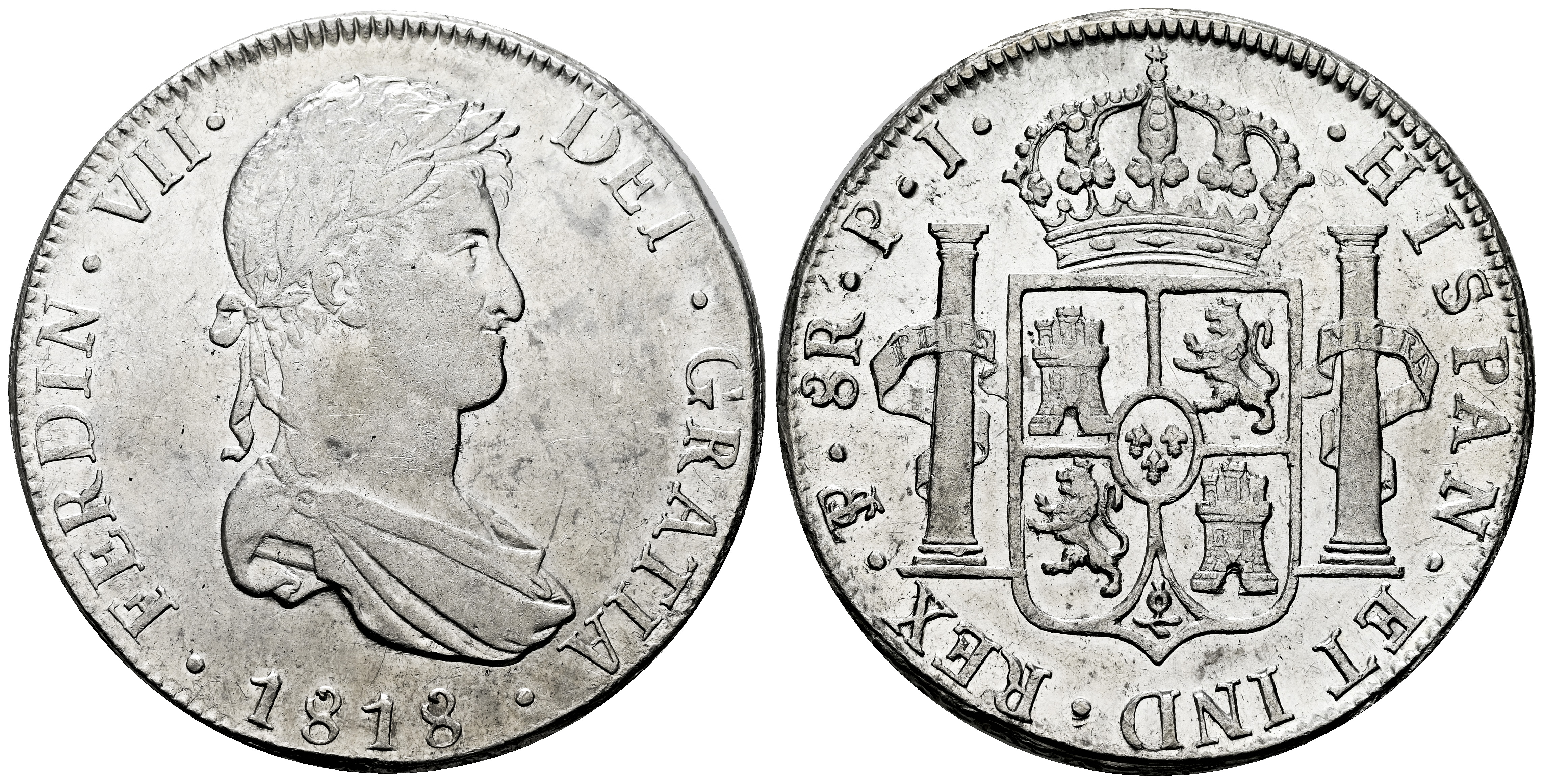 Fernando VII (1808-1833). 8 reales. 1818. Potosí. PJ. (Cal-1382). Ag. 26,78 g. Rayitas. Restos de brillo original, sobre todo en reverso. MBC+/EBC-. Est...150,00.