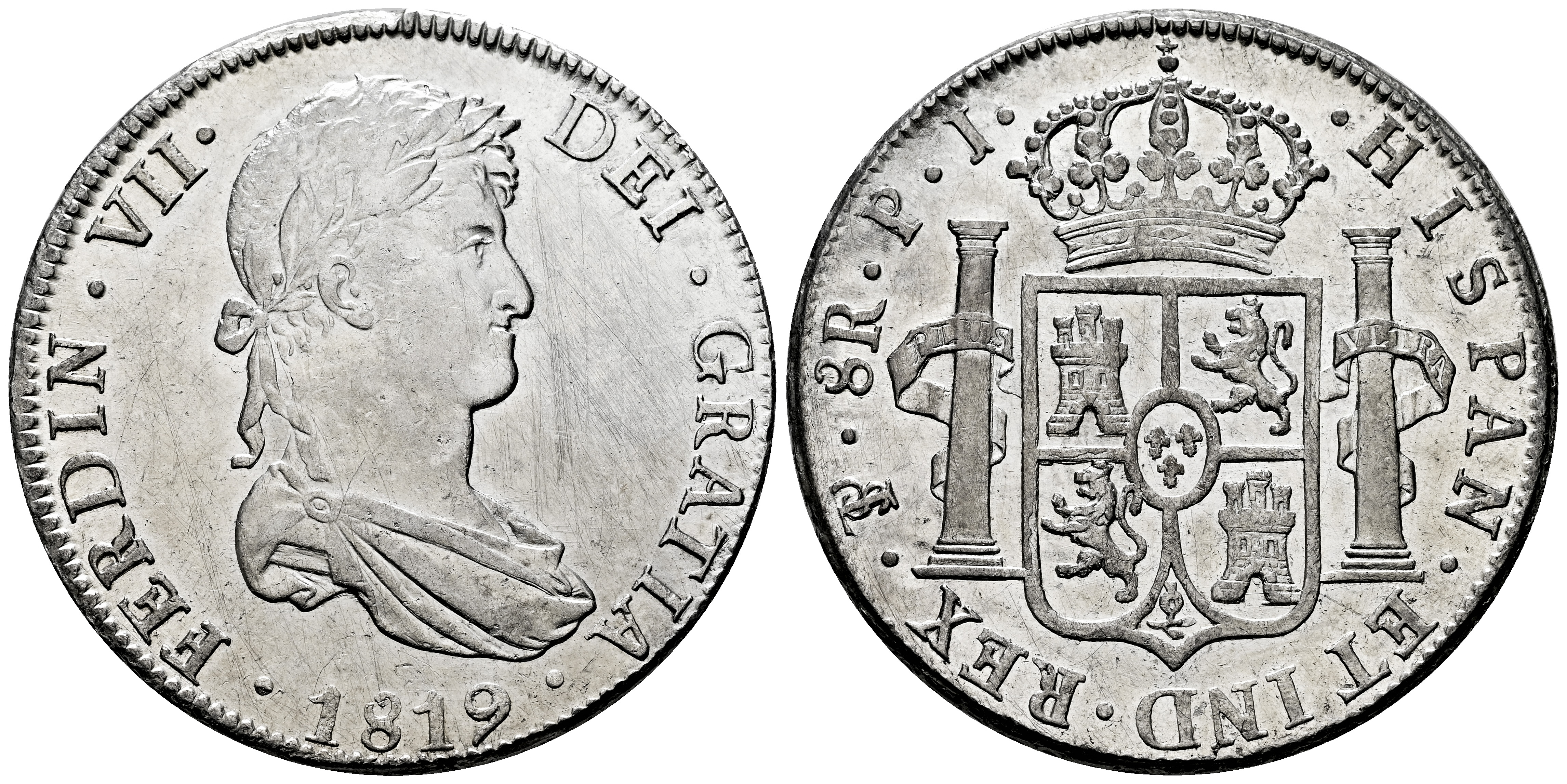 Fernando VII (1808-1833). 8 reales. 1819. Potosí. PJ. (Cal-1383). Ag. 26,76 g. Suaves rayitas en anverso. Brillo original. EBC-/EBC. Est...180,00.