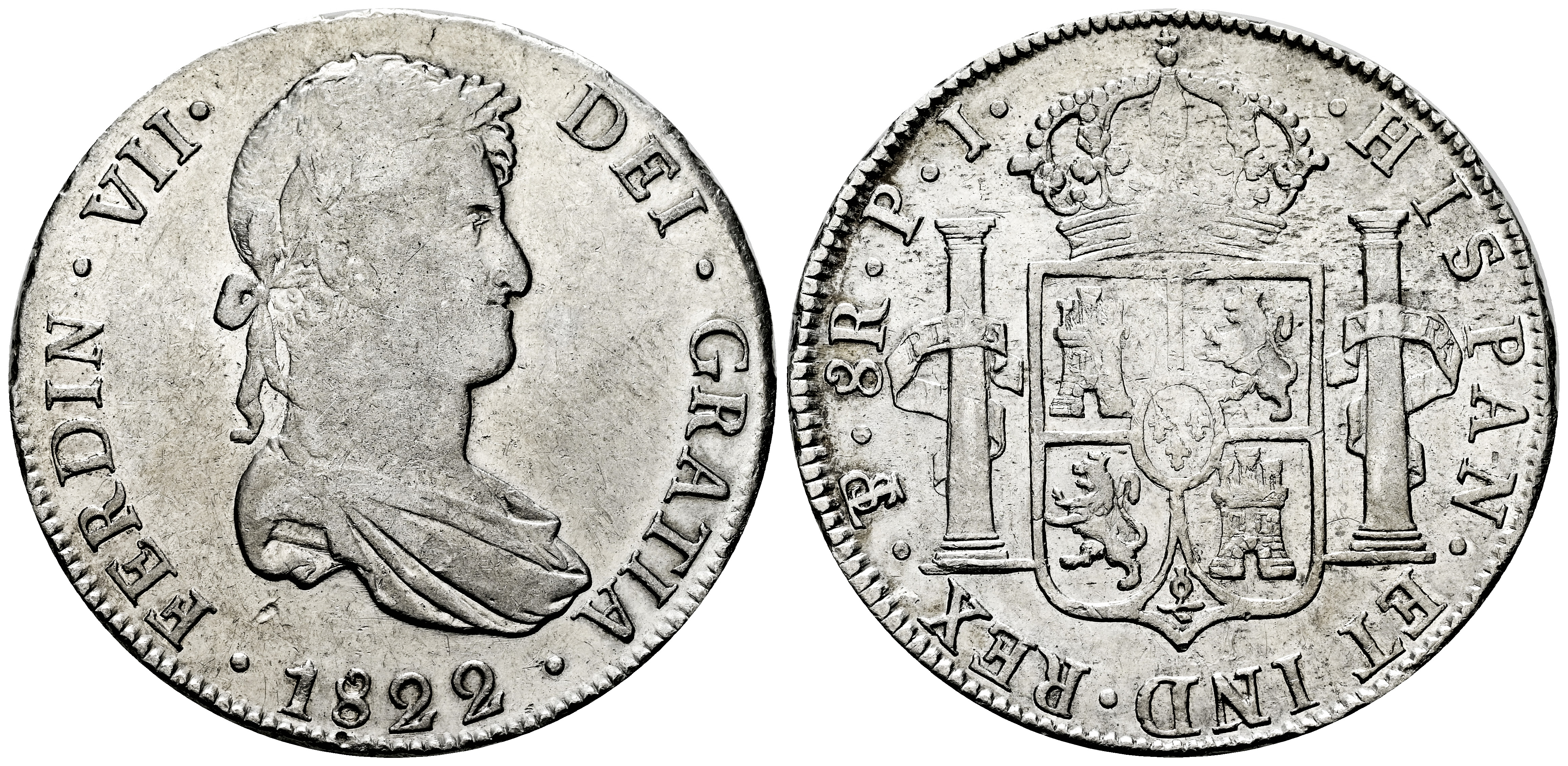 Fernando VII (1808-1833). 8 reales. 1822. Potosí. PJ. (Cal-1386). Ag. 26,92 g. Acuñación floja. Pequeños restos de brillo original. MBC/MBC+. Est...120,00.