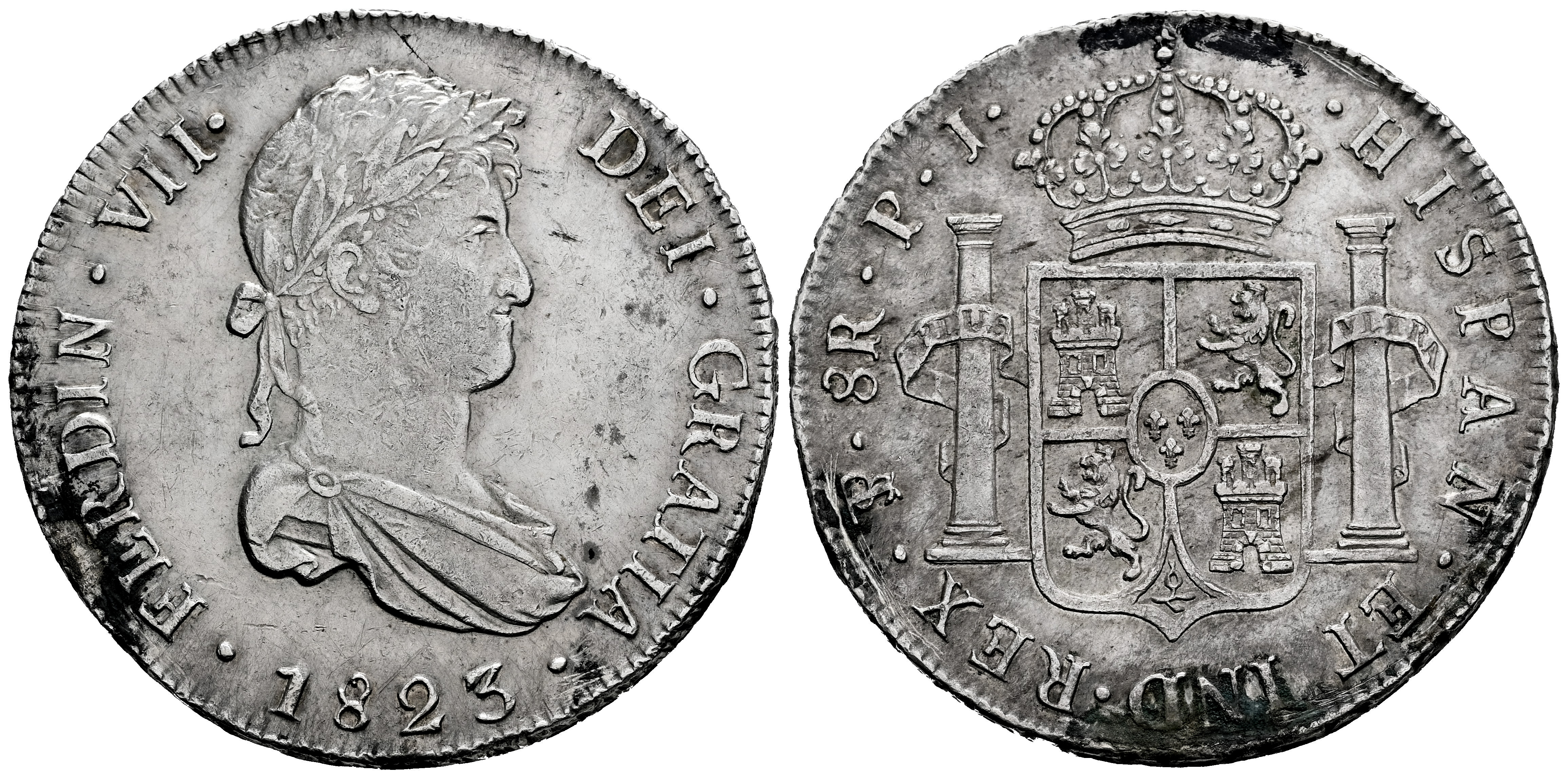 Fernando VII (1808-1833). 8 reales. 1823. Potosí. PJ. (Cal-1388). Ag. 26,91 g. Ligeras oxidaciones limpiadas . MBC+. Est...120,00.