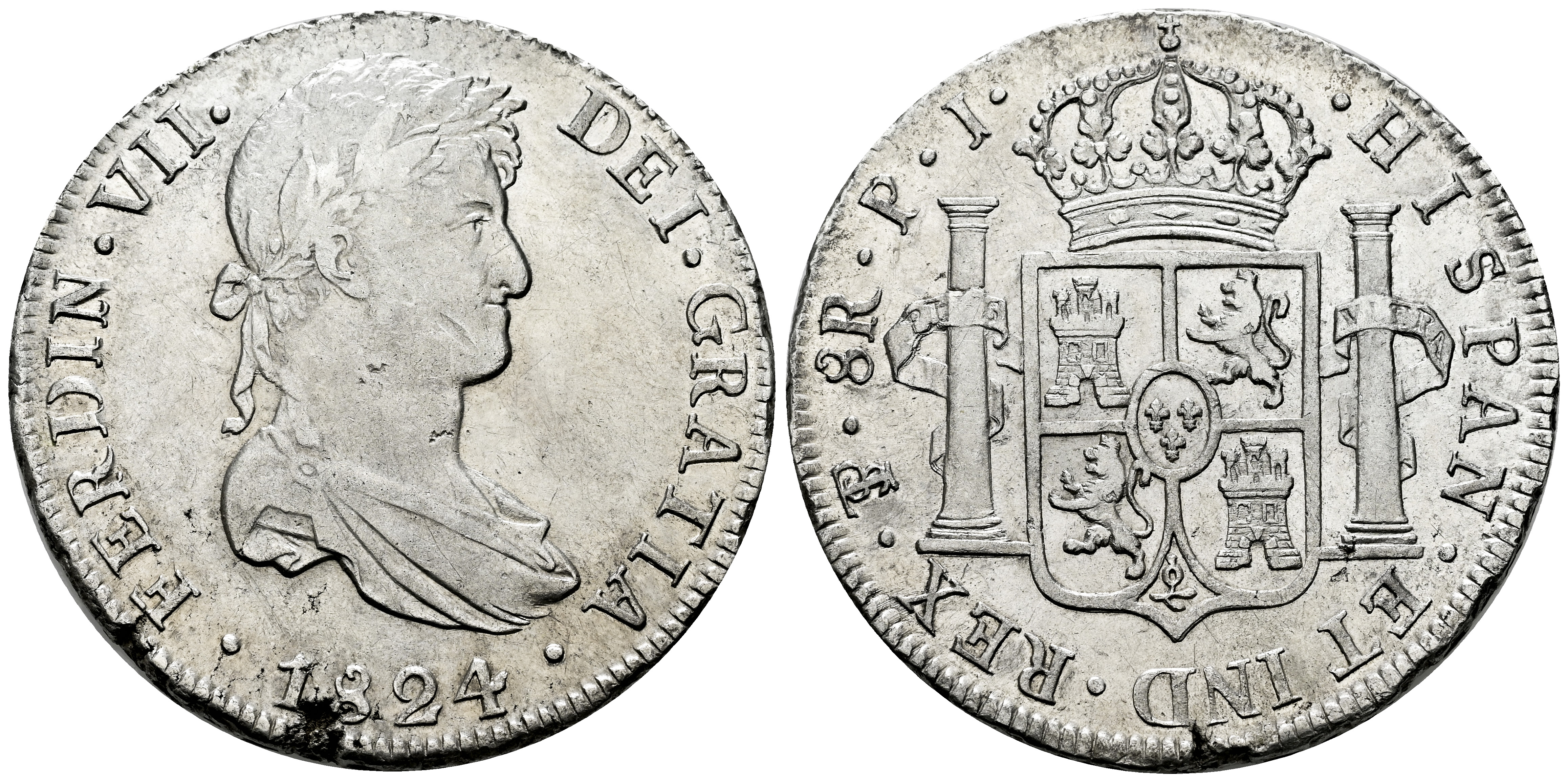 Fernando VII (1808-1833). 8 reales. 1824. Potosí. PJ. (Cal-1391). Ag. 26,92 g. Defecto en canto y leves golpecitos. Restos de brillo original. MBC+/EBC-. Est...150,00.