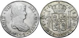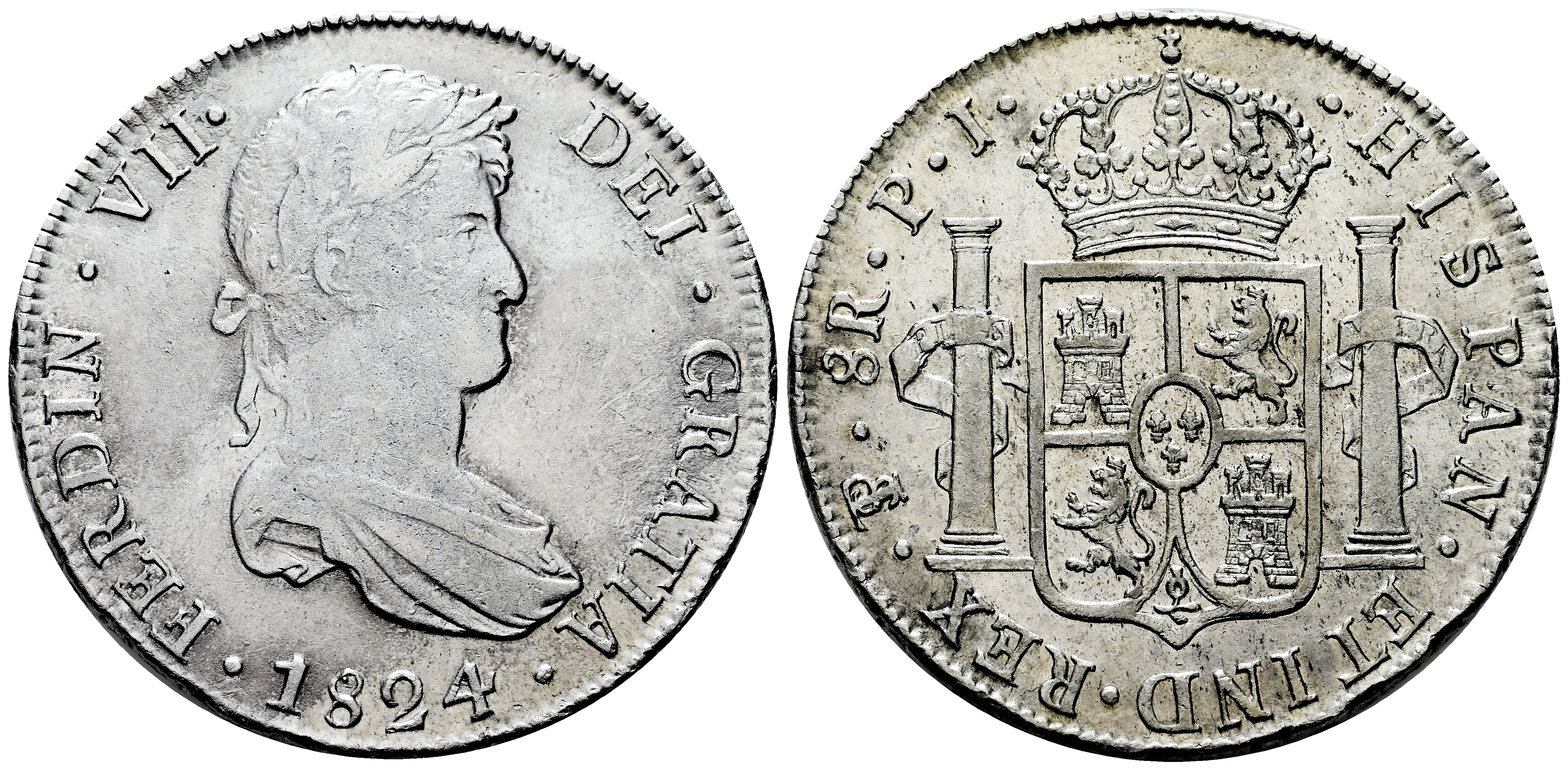 Fernando VII (1808-1833). 8 reales. 1824. Potosí. PJ. (Cal-1391). Ag. 27,70 g. Acuñación floja. Leves arañazos. Restos de brillo original. MBC+/EBC-. Est...150,00.