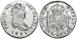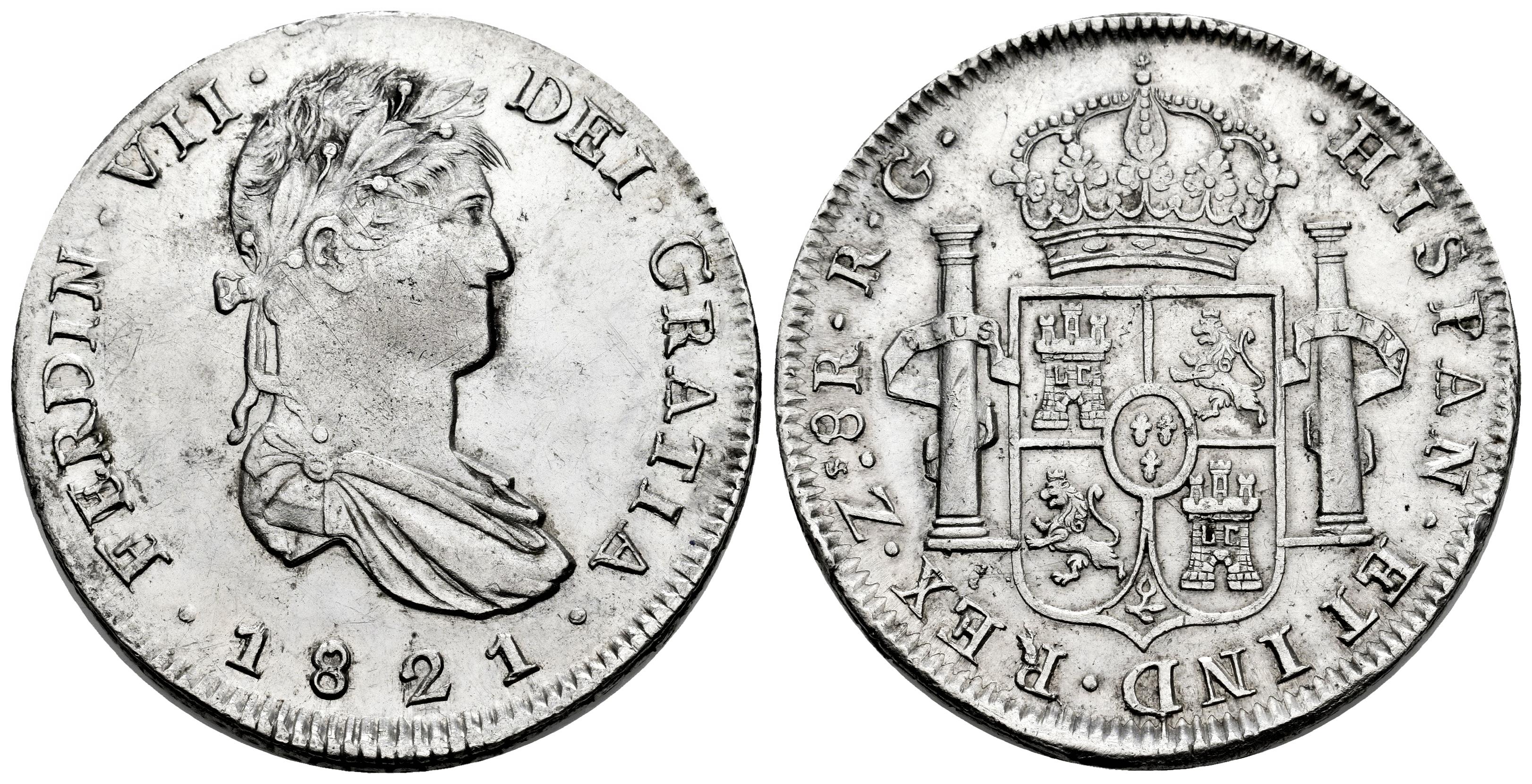 Fernando VII (1808-1833). 8 reales. 1821. Zacatecas. RG. (Cal-1465). Ag. 27,12 g. Restos de brillo original. Rayitas y golpecitos en el canto. EBC-. Est...300,00.