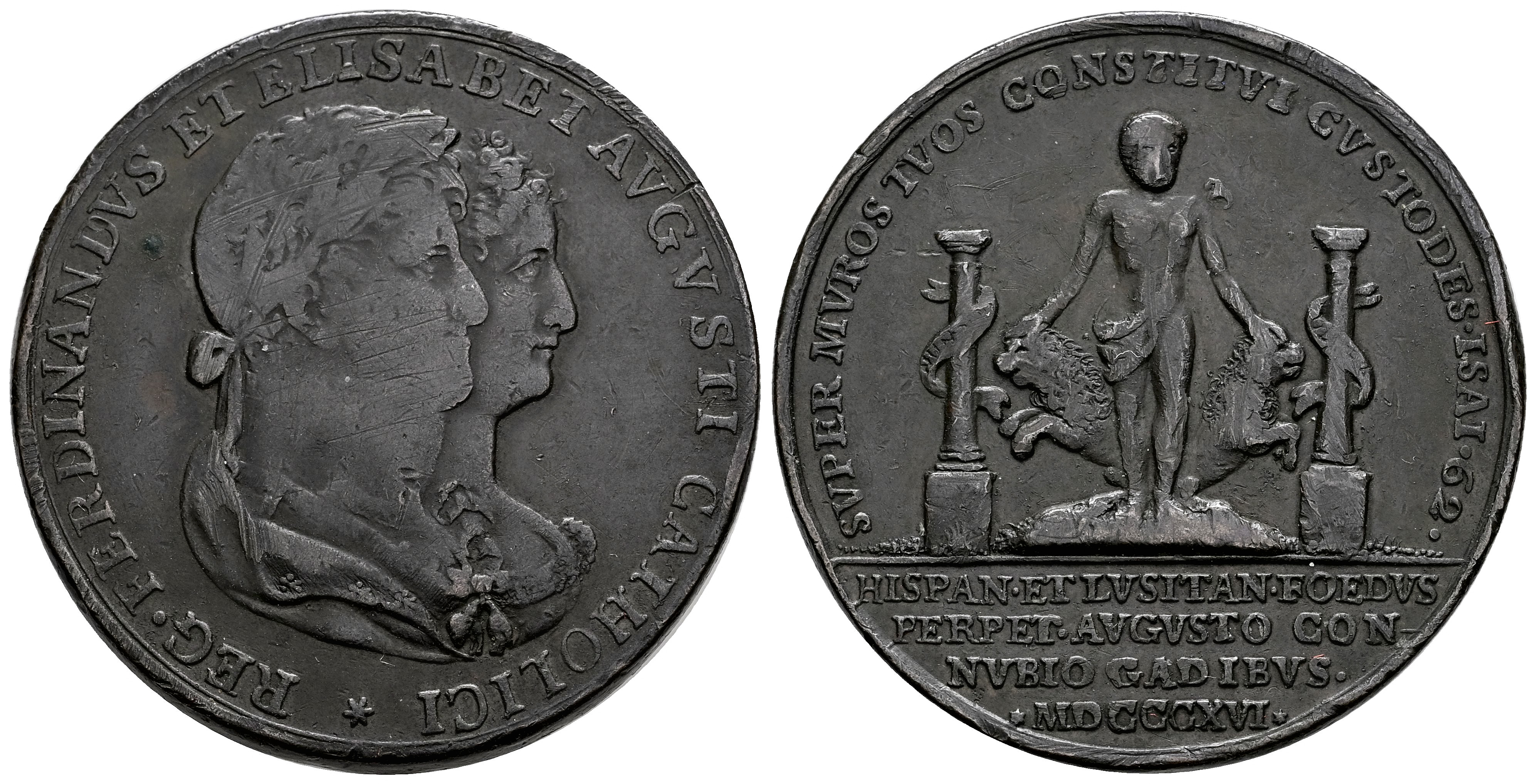 Fernando VII (1808-1833). Medalla. 1816. Cádiz. (Herrera-497). (Vives-322). Ae. 18,80 g. Matrimonio de Fernando VII con María Isabel de Braganza. 34 mm. Rayitas. . BC+/MBC-. Est...40,00.