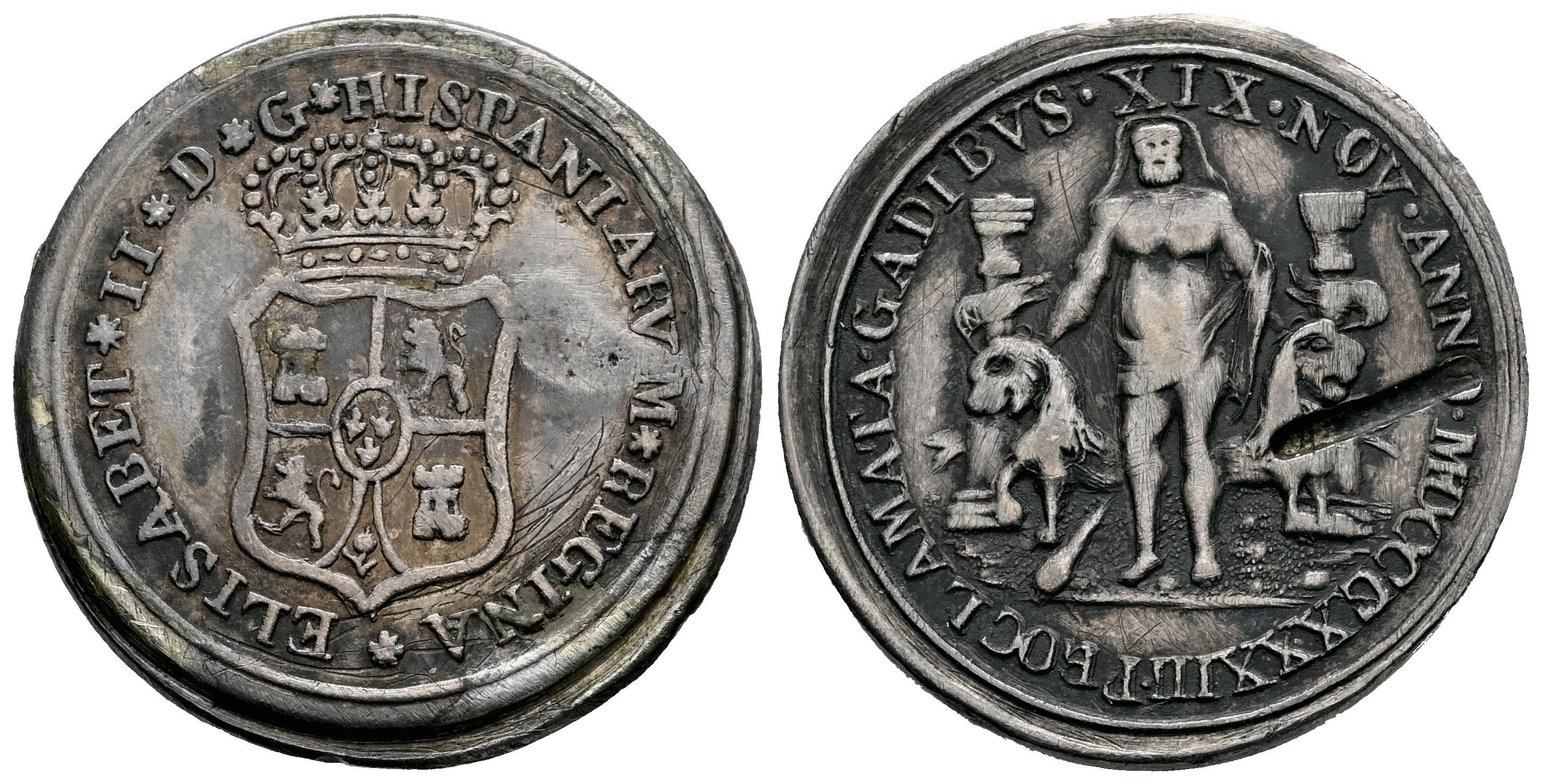 Isabel II (1833-1868). Medalla de proclamación. 1833. Cádiz. (Herrera-8). (Vives-741). (Vq-13358). Ag. 6,29 g. Ligera pátina. Corte de prueba en reverso y rayas. MBC. Est...60,00.