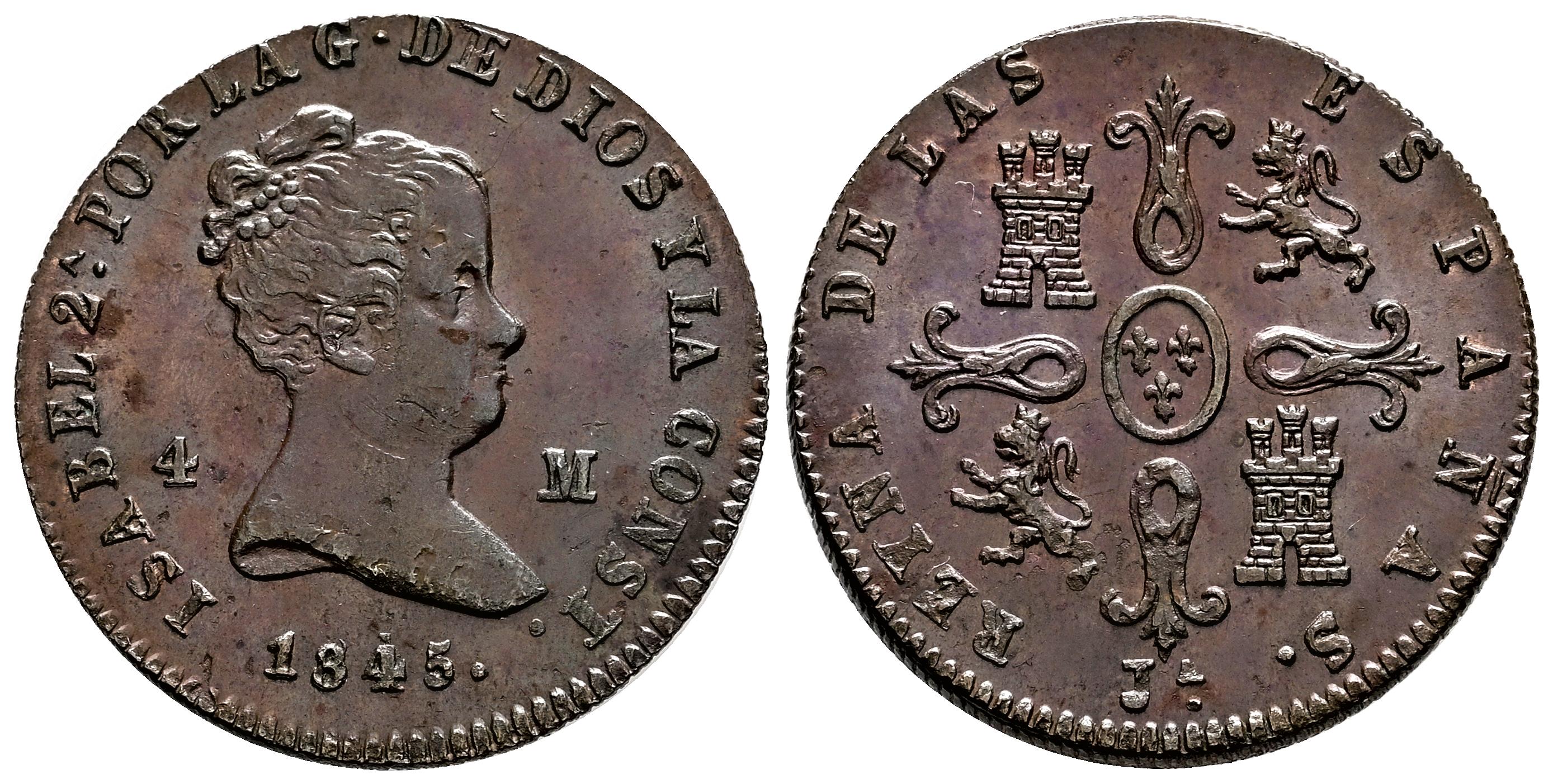 Isabel II (1833-1868). 4 1/2 piastre. 1845. Jubia. (Cal-71). Ae. 5,60 g. Marquitas en anverso. EBC/EBC+. Est...100,00.