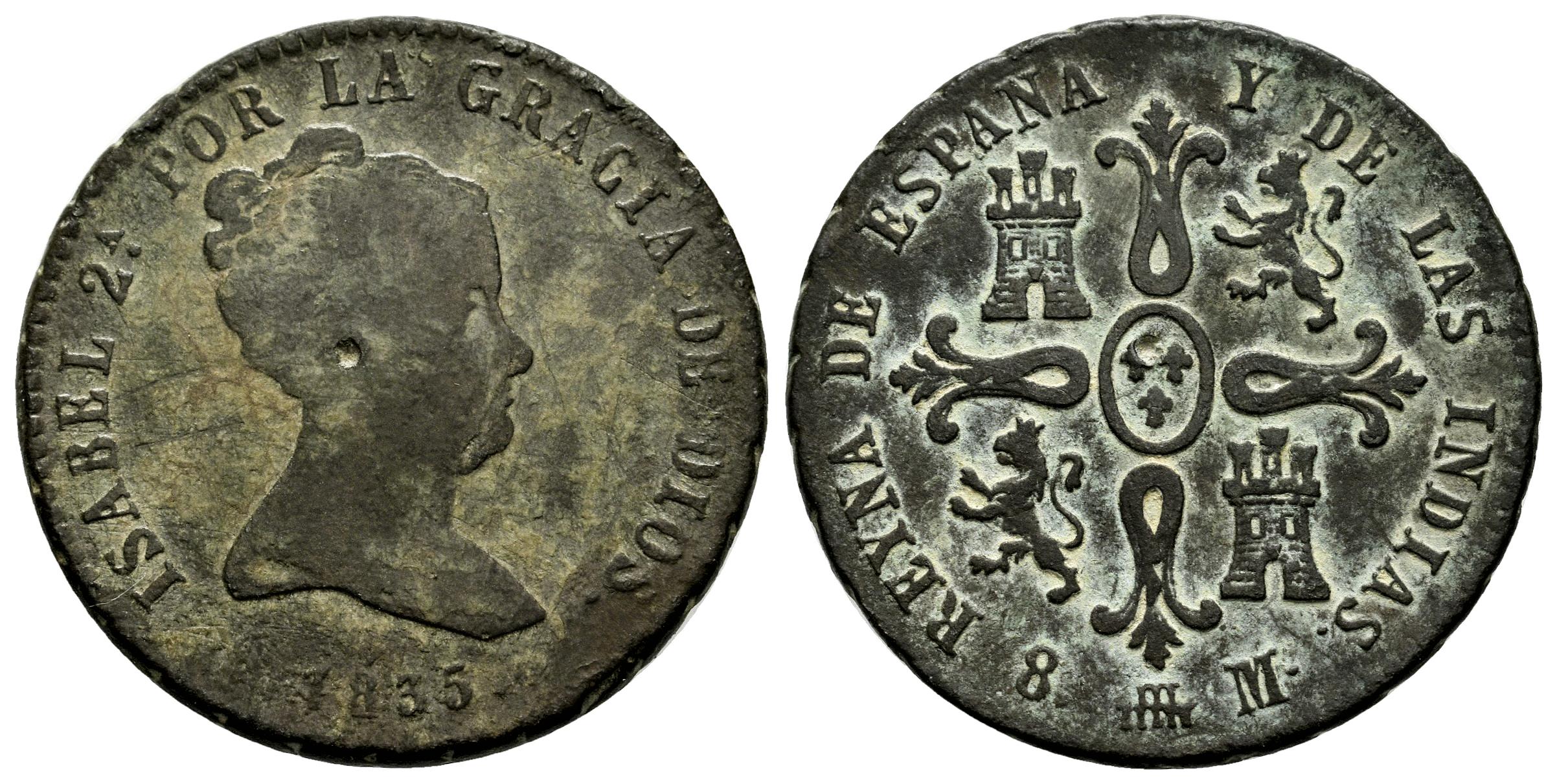 Isabel II (1833-1868). 8 maravedís. 1835. Segovia. (Cal-121). Ae. 10,41 g. Valor en reverso. Escasa. BC/MBC. Est...30,00.