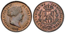 Isabel II (1833-1868). 5 céntimos de real. 1859. Segovia. (Cal-164). Ae. 2,02 g. Restos de brillo original. EBC+/EBC. Est...60,00.