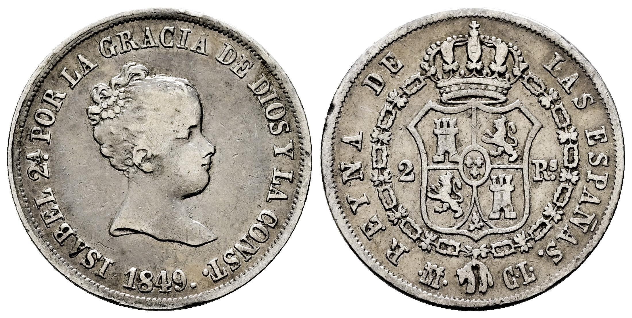 Isabel II (1833-1868). 2 reales. 1849. Madrid. CL. (Cal-366). Ag. 2,55 g. Golpecitos en el canto. MBC-/MBC. Est...30,00.