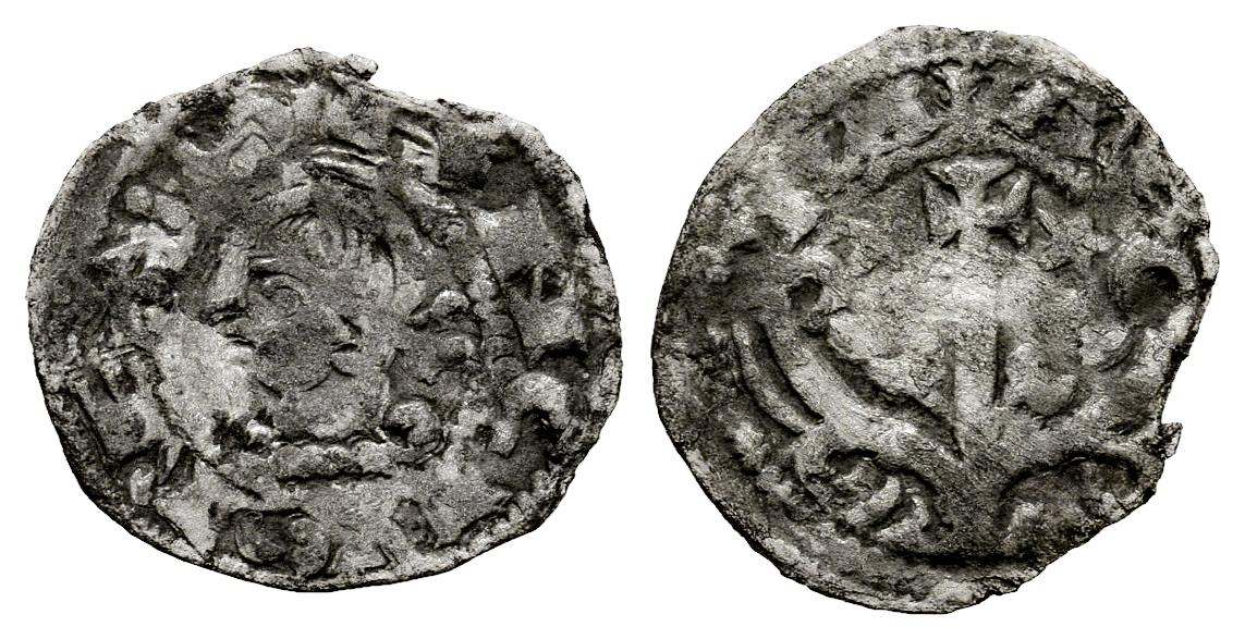 Reino de Navarra. Sancho VI, el Sabio (1150-1194). Óbolo. Navarra. (Ros-3.8.3). Anv.: : SANCIVS REX. Busto a la izquierda. Rev.: NAVARA. Árbol coronado por una cruz con estrellas de 5 puntas a cada lado. Ve. 0,89 g. Muy rara. BC+. Est...150,00.