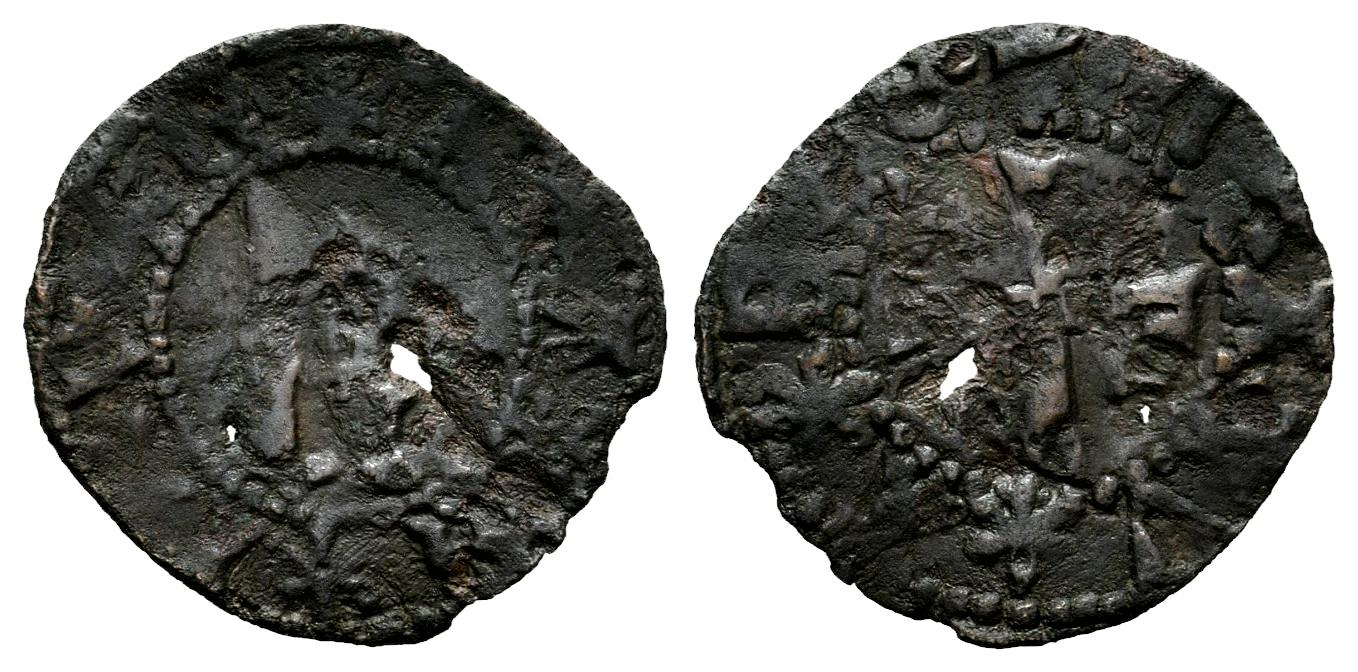 Reino de Navarra. Carlos IV, Príncipe de Viana (1441-1461). 1/2 Cornado. Navarra. (Ros-3.18.5). (Cru V.S-261). Anv.: + K ✱ A ✱ R ✱ T ✱ V ✱ Ƨ . K gótica sin corona. Rev.: + · N ✱ A ✱ V ✱ A ✱ R ✱ E · . Cruz. Ve. 0,48 g. La "S" de KARTVS invertida. Leves oxidaciones. Agujero. Muy rara. Ex Tauler&Fau, Colección Príncipe de Viana (24/06/2024), lote 1305. BC+. Est...50,00.