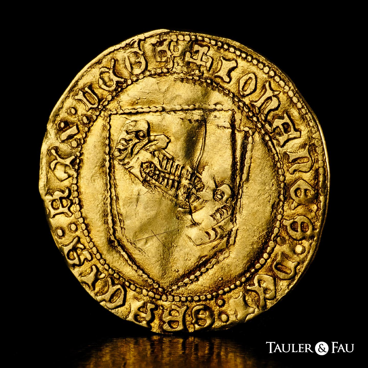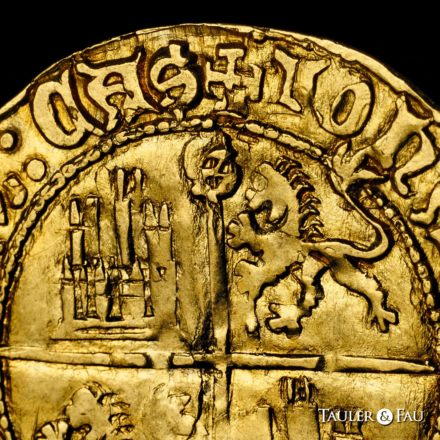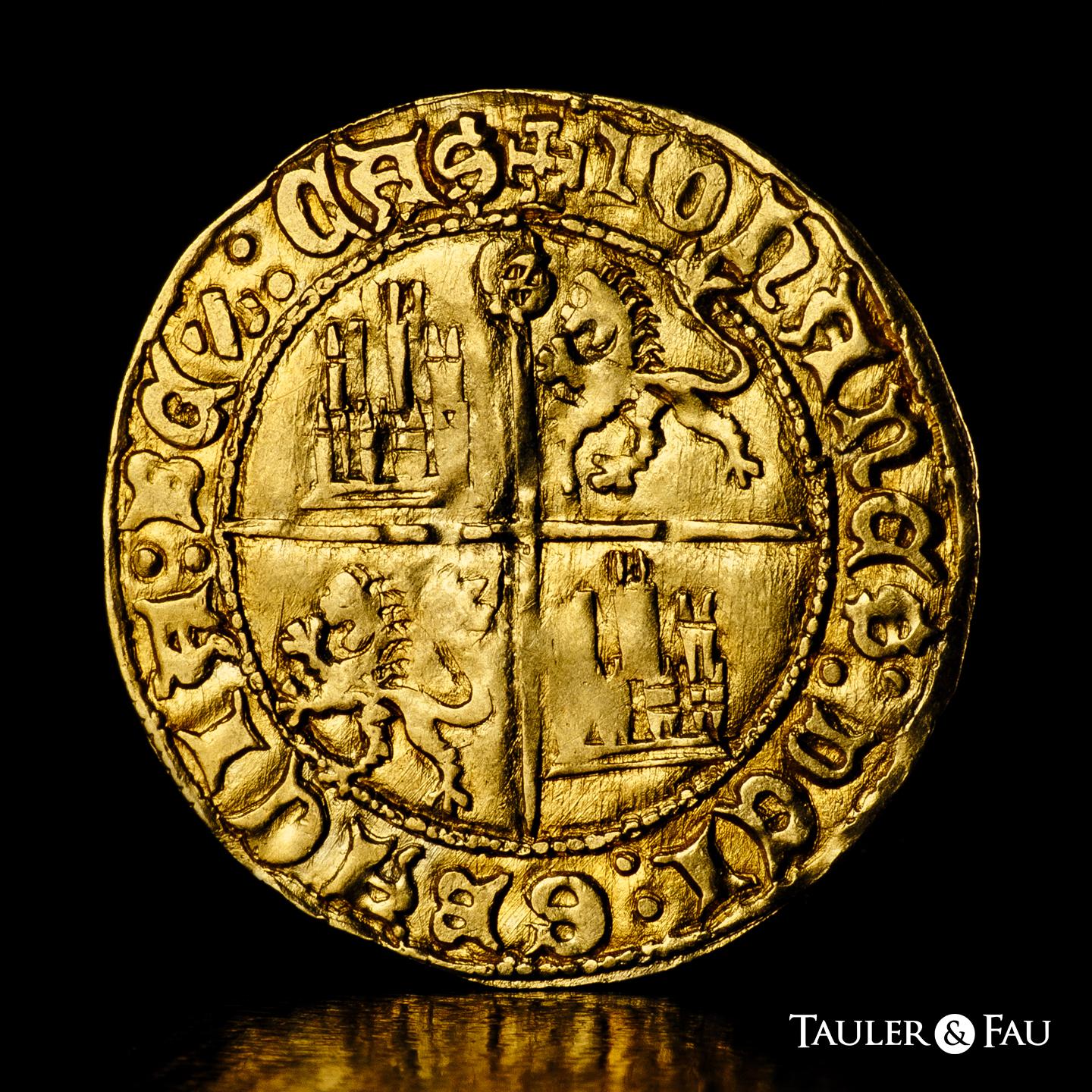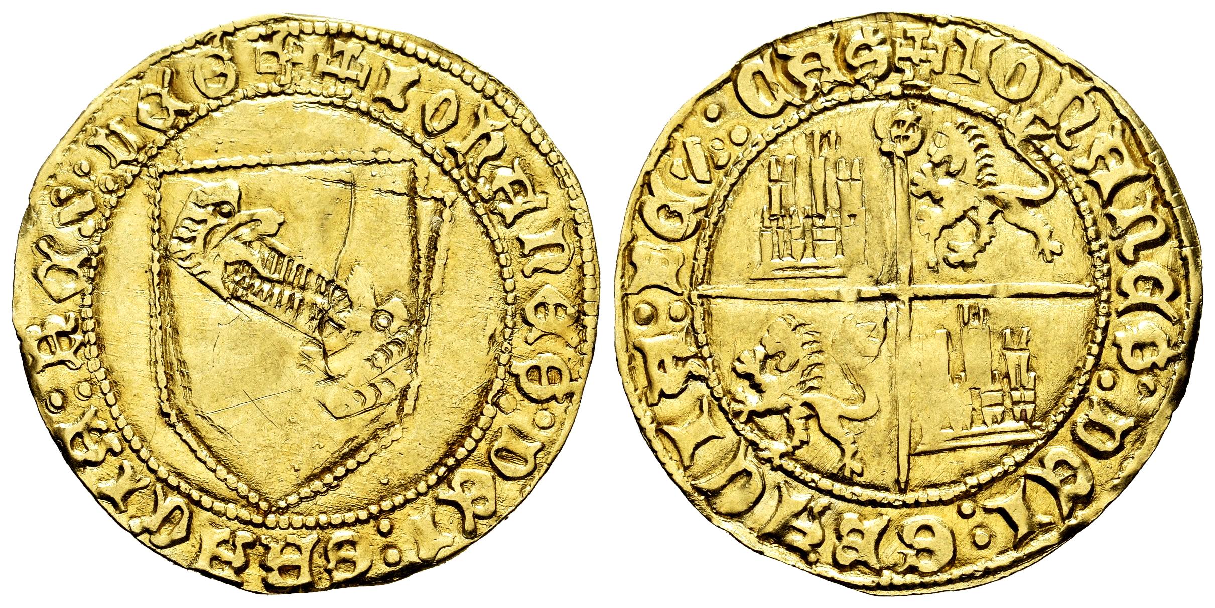 Reino de Castilla y León. Juan II (1406-1454). Dobla de la Banda. Sevilla. (Bautista-791 var.). (MMM-J2:6.42). Anv.: + IOhANES : DEI : GRACIA : REX : LEG. Rev.: + IOhANES : DEI : GRACIA : REX : CAS. Au. 4,51 g. Leones sin corona. S en el extremo superior del eje vertical. Flan grande. Leve doble acuñación. MBC. Est...1500,00.