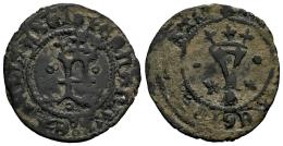 Fernando e Isabel (1474-1504). Blanca. Coruña. (Cal-8). (Bautista-0284). Ve. 1,25 g. Roeles en anverso y puntos en reverso. Descentrada. Ex Colección Orol. MBC/MBC-. Est...35,00.