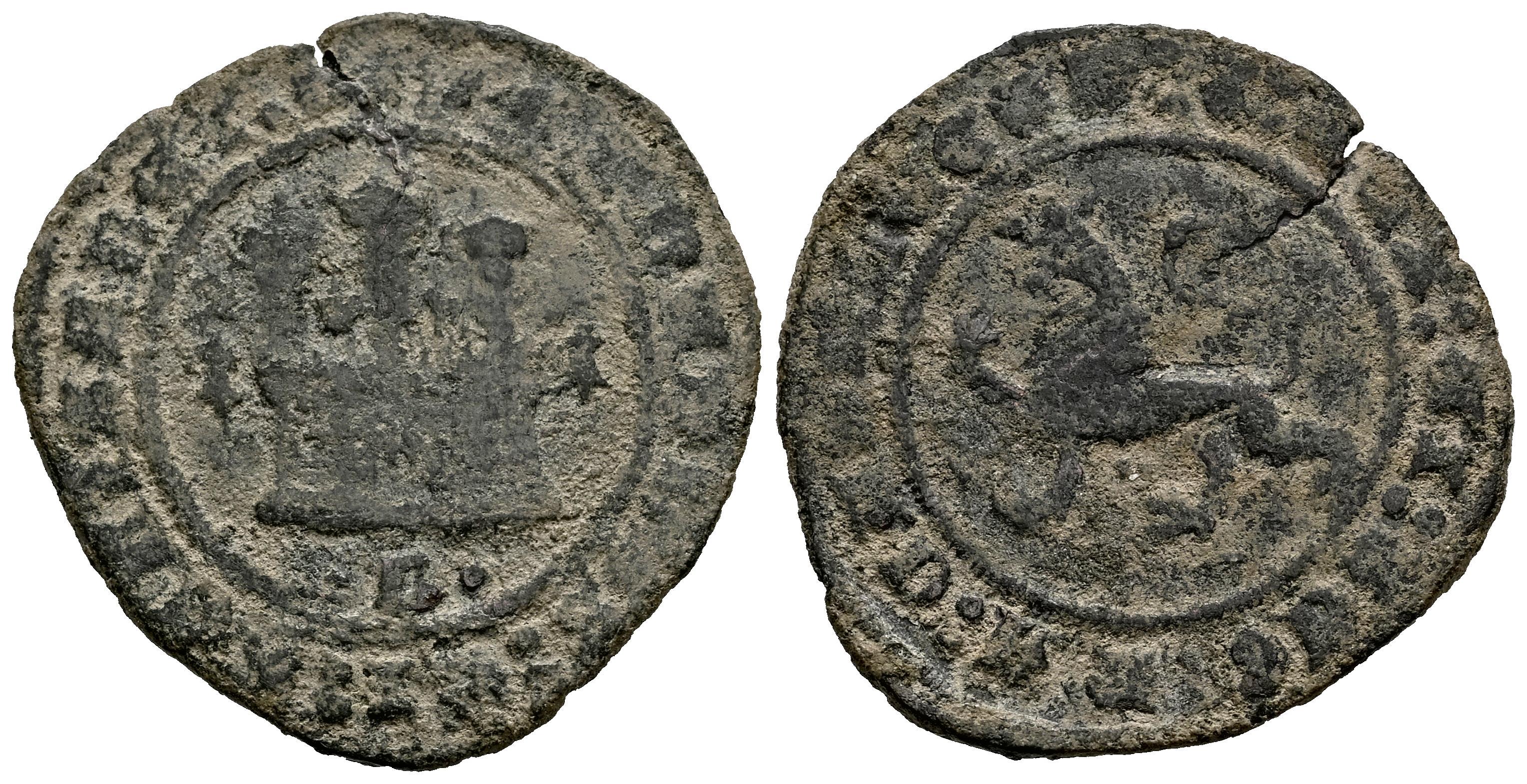 Fernando e Isabel (1474-1504). 2 maravedís. Burgos. (Cal-66). (Rs-52). Ae. 4,06 g. Castillo entre armiños con B entre puntos debajo. Grieta. MBC-. Est...50,00.