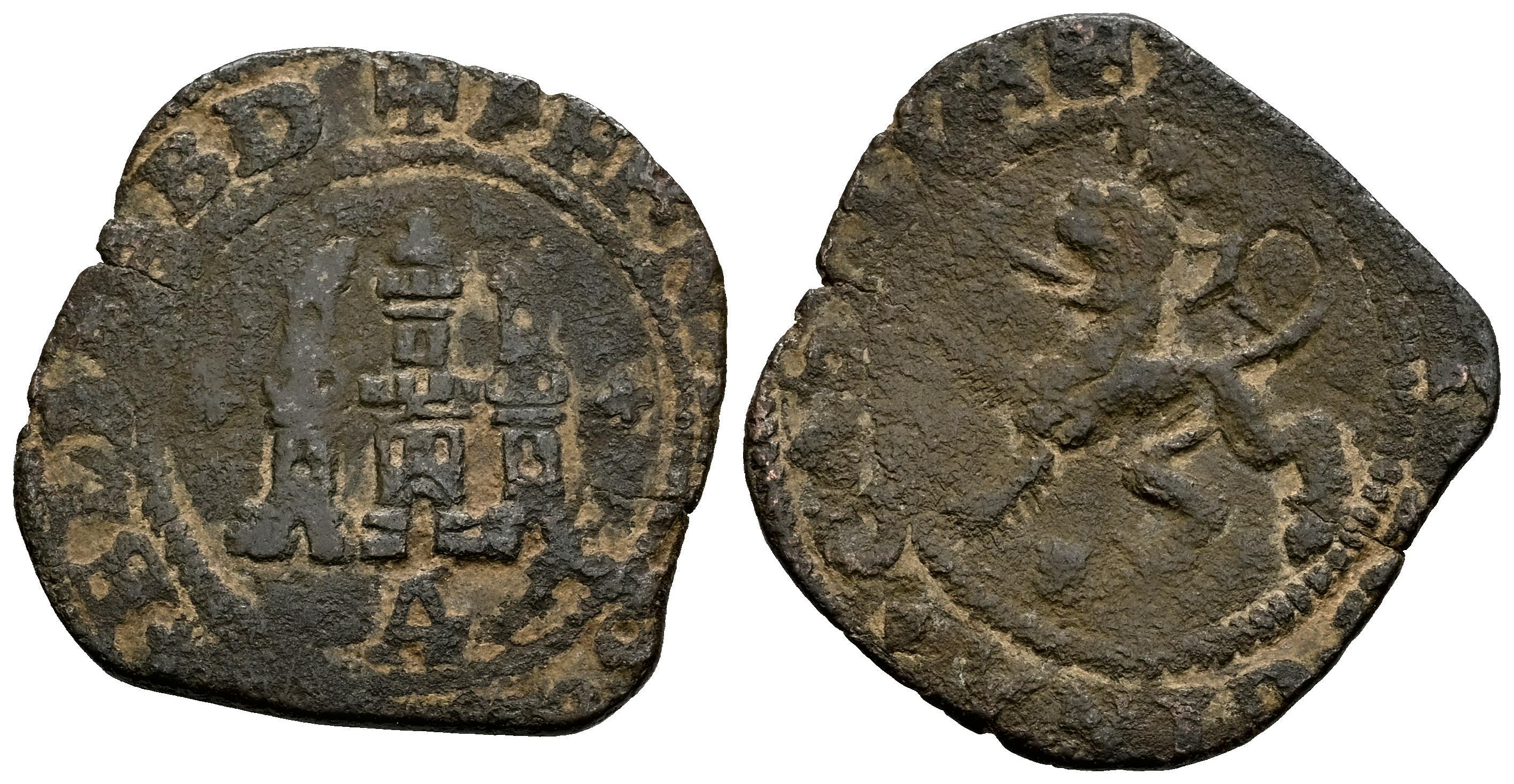 Fernando e Isabel (1474-1504). 2 maravedís. Coruña. A. (Cal-75). (Bautista-0413). Ve. 3,46 g. Cruces a los lados del castillo, venera bajo el león. Ex Colección Orol. MBC-. Est...45,00.