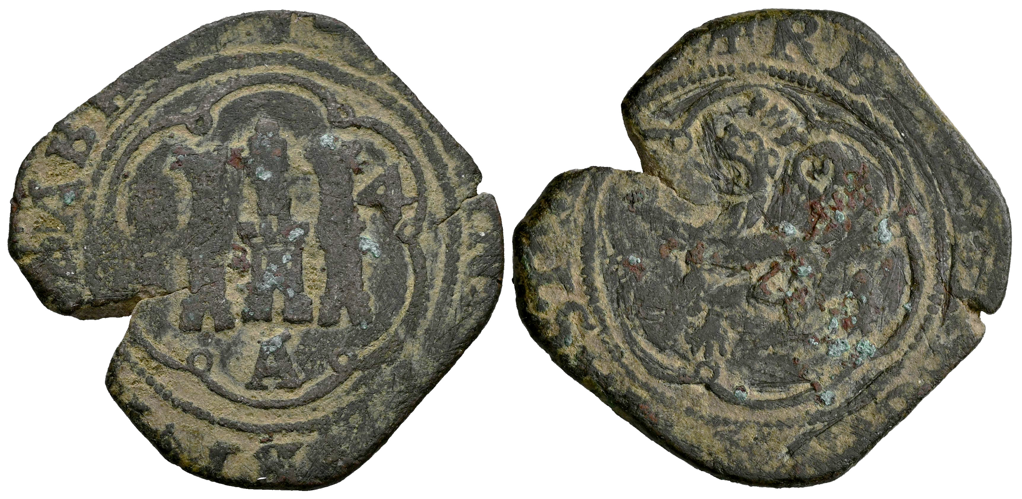 Fernando e Isabel (1474-1504). 4 maravedís. Coruña. A. (Cal-125). Ve. 6,23 g. Venera-4 a los lados del castillo, A debajo y venera debajo del león. Oxidaciones. BC+. Est...45,00.