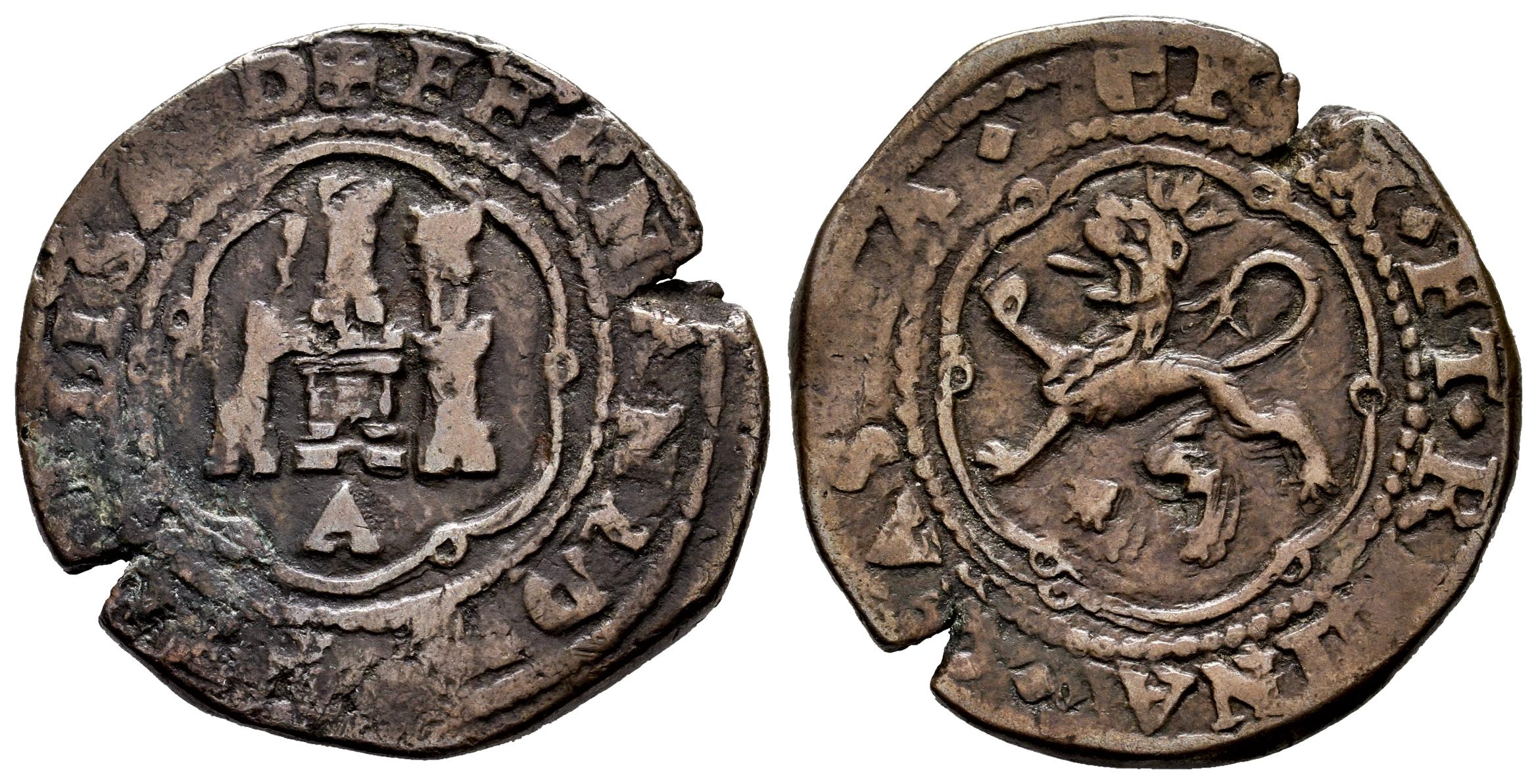 Fernando e Isabel (1474-1504). 4 maravedís. Coruña. A. (Cal-125). (Rs-104). Ae. 7,62 g. A bajo el castillo y venera bajo el león. MBC-/MBC. Est...45,00.