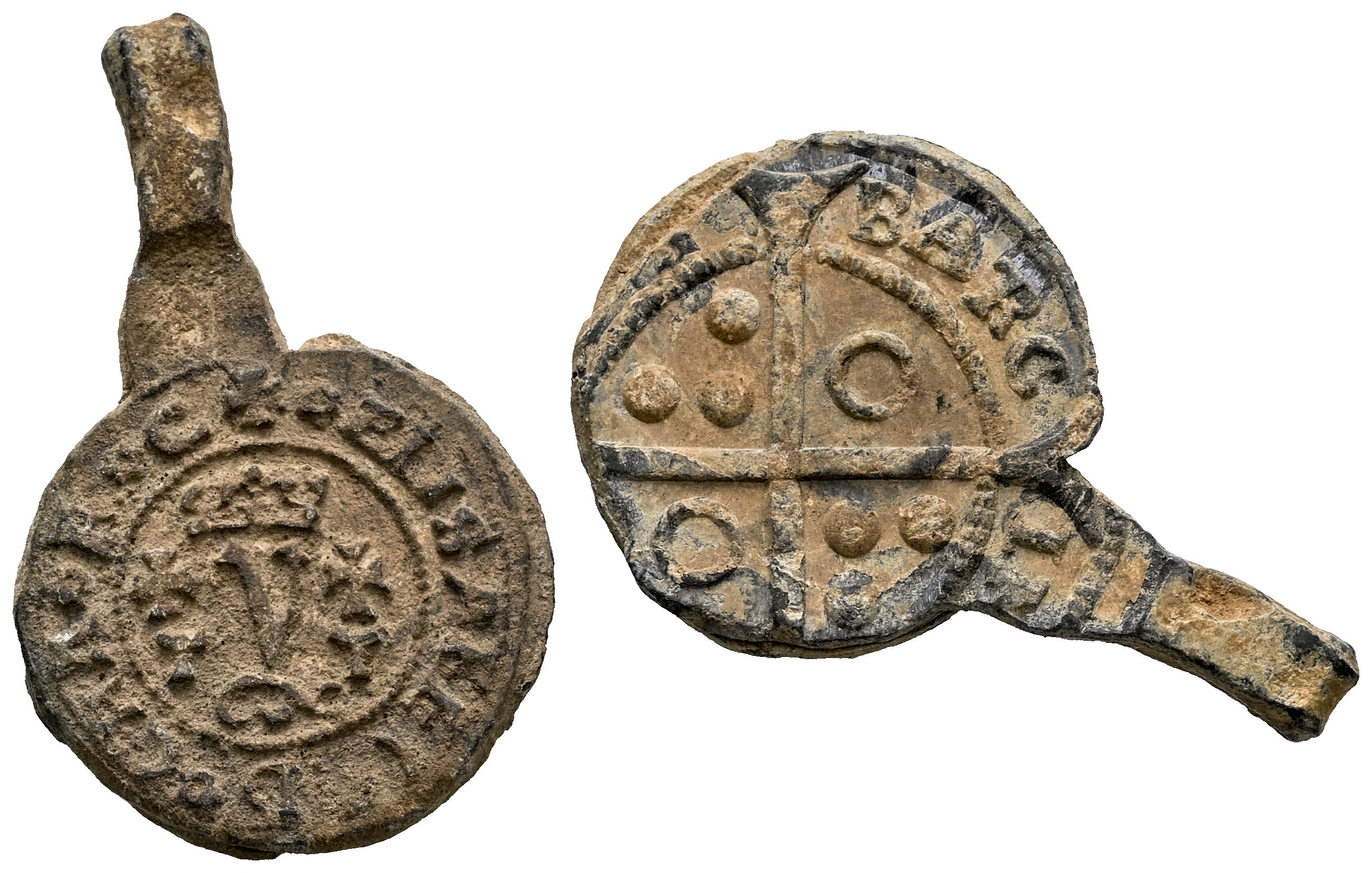 Fernando e Isabel (1474-1504). Pb. 5,07 g. Precinto en plomo de una blanca de Toledo y 1 croat de Barcelona. MBC+. Est...35,00.