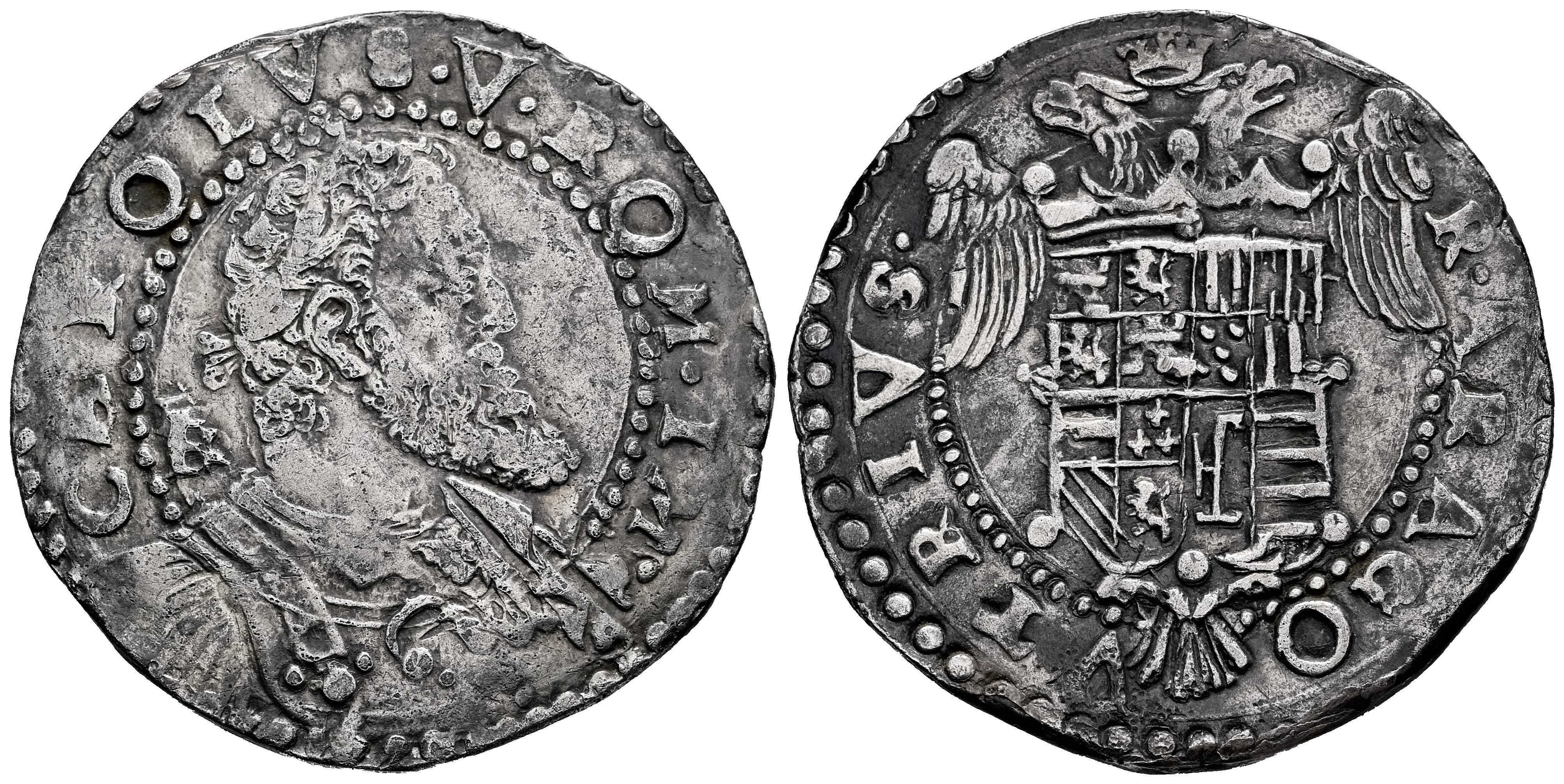 Carlos I (1516-1556). 1/2 ducado. ND. Nápoles. IBR. (Tauler-246). (Vti-293). (Mir-Nap-135). Ag. 14,62 g. Tono. Conserva la etiqueta del comerciante. MBC. Est...350,00.
