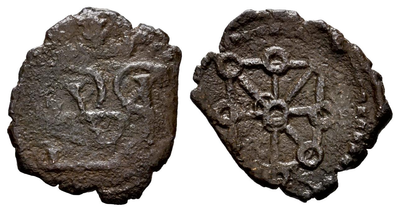 Felipe II (1556-1598). Cornado. ND. Pamplona. (Cal-21). (Ros-4.3.22/1). Anv.: Monograma coronado entre ¿puntos?. Rev.: Escudo de Navarra sin corona acotado por roeles, con 9 eslabones. Ae. 1,00 g. Rara. BC/MBC. Est...50,00.