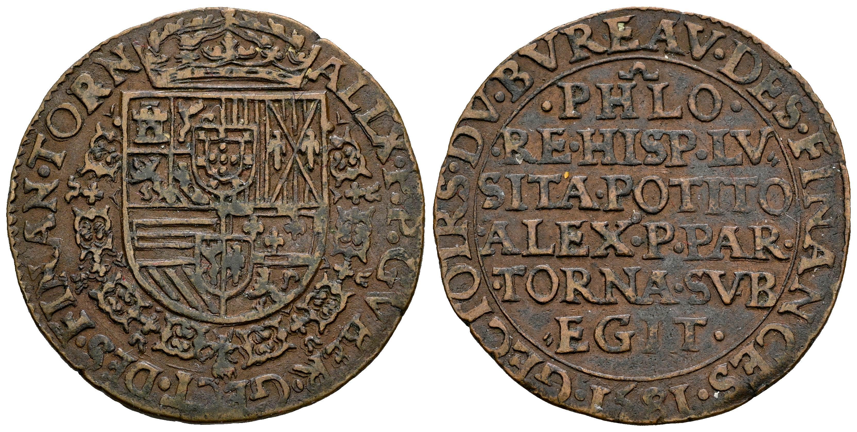 Felipe II (1556-1598). Jetón. 1581. (Dugn-2841). Ae. 5,06 g. Toma de Tournais por el duque de Parma. MBC. Est...50,00.