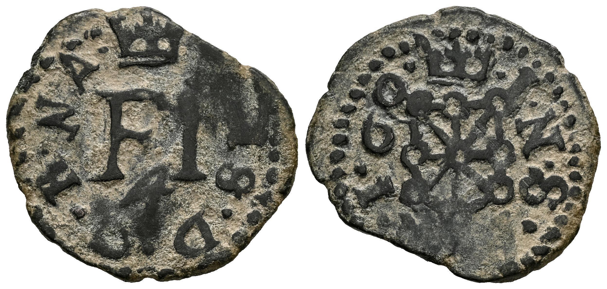 Felipe III (1598-1621). 4 cornados. 1608 (168). Pamplona. (Cal-62 var.). (Ros-4.4.8). Anv.: (P · H) S · D · G · R · N · A · . Rev.: · I · N · S · A · N · I · 6 8 ·. Ae. 3,17 g. Escasa. MBC. Est...60,00.