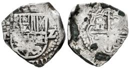 Felipe III (1598-1621). 2 reales. Potosí. T. (Cal-tipo 129). Ag. 6,77 g. Fecha no visible. Valor 2 como Z. Oxidaciones en reverso. MBC-/BC+. Est...70,00.