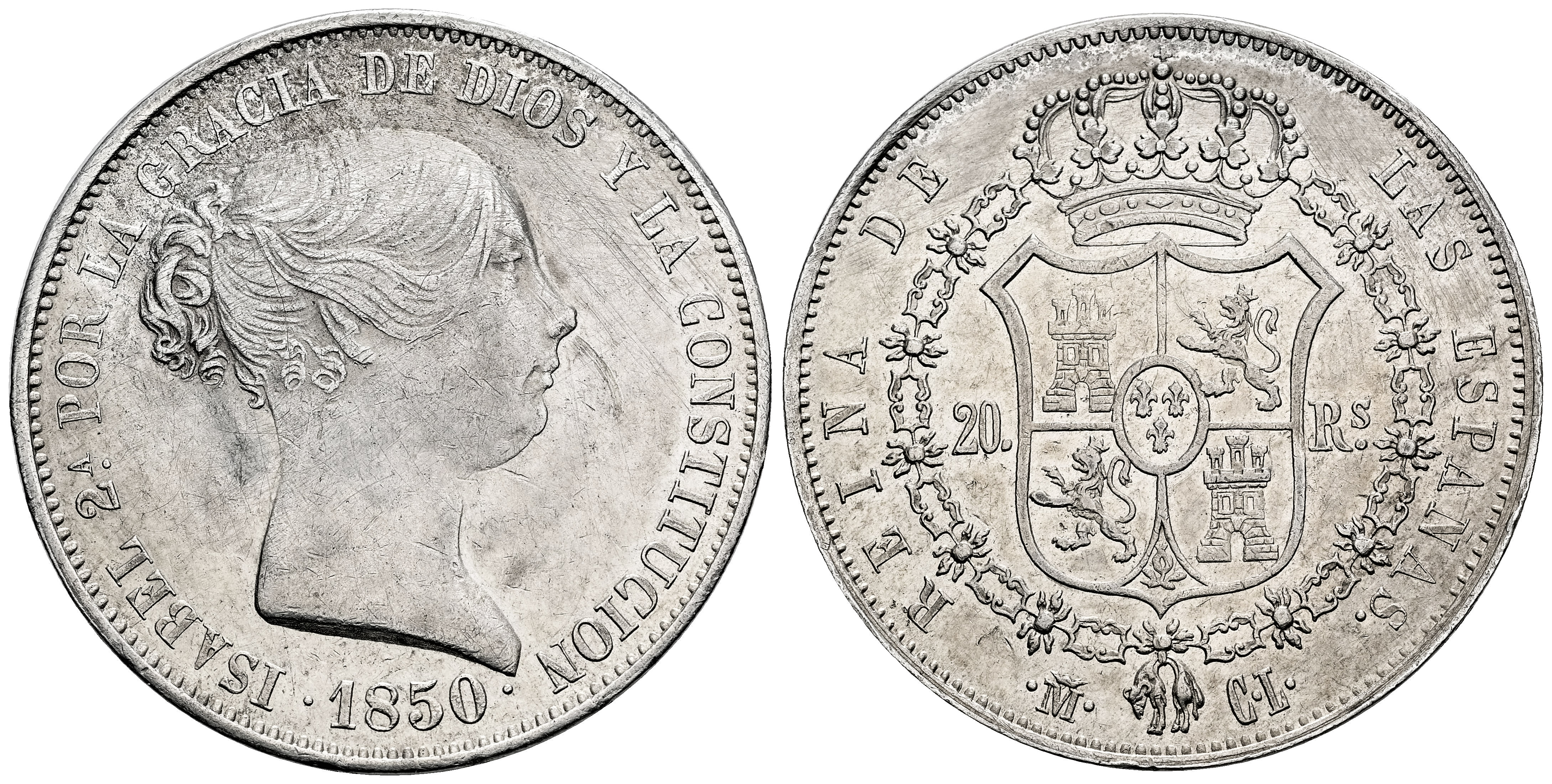 Isabel II (1833-1868). 20 reales. 1850. Madrid. CL. (Cal-591). Ag. 25,96 g. Leves rayas. Restos de brillo original. Escasa. MBC+/EBC-. Est...250,00.