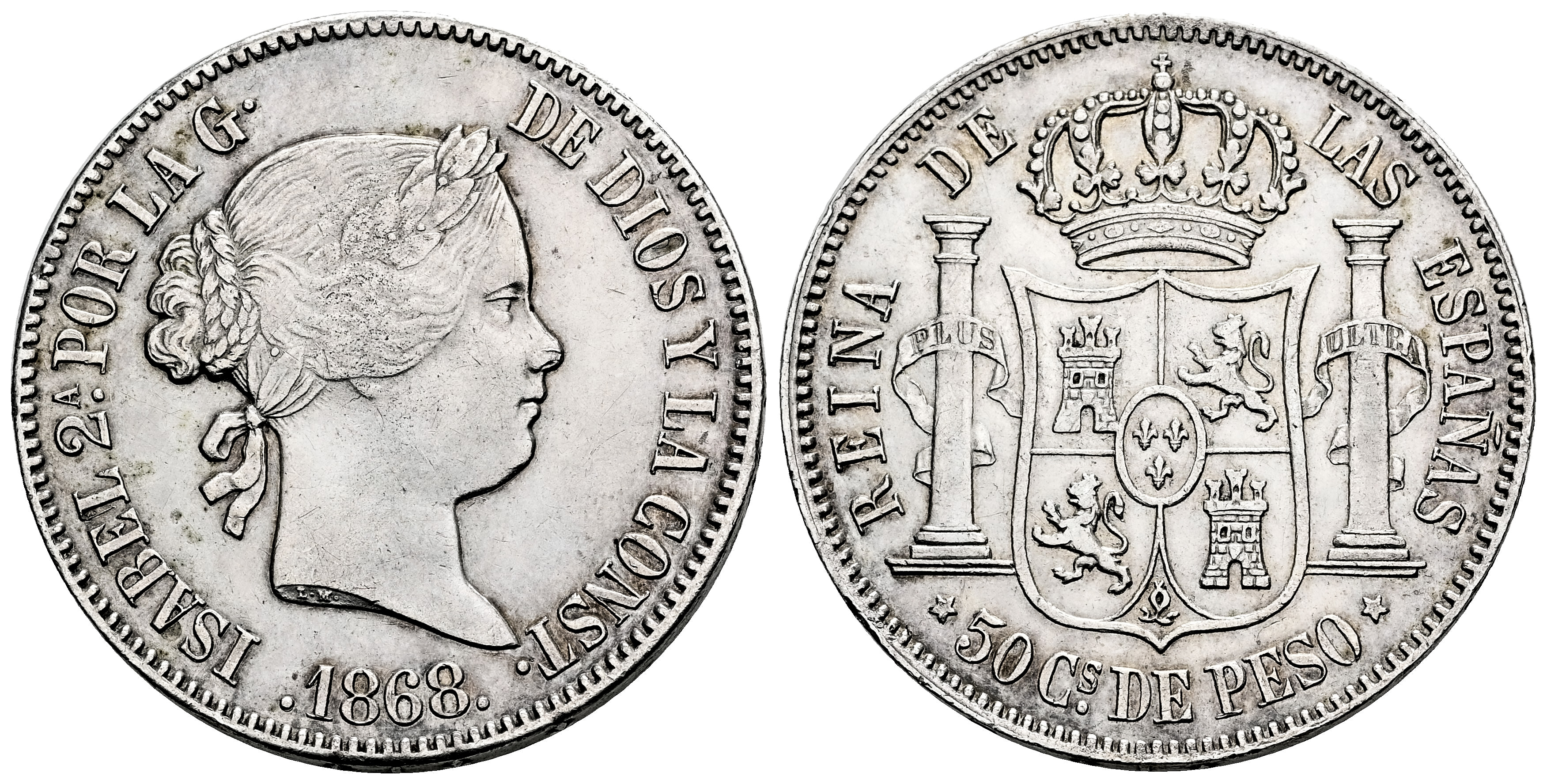 Isabel II (1833-1868). 50 centavos. 1868. Manila. (Cal-667). Ag. 12,87 g. Ligeramente limpiada. MBC+. Est...150,00.