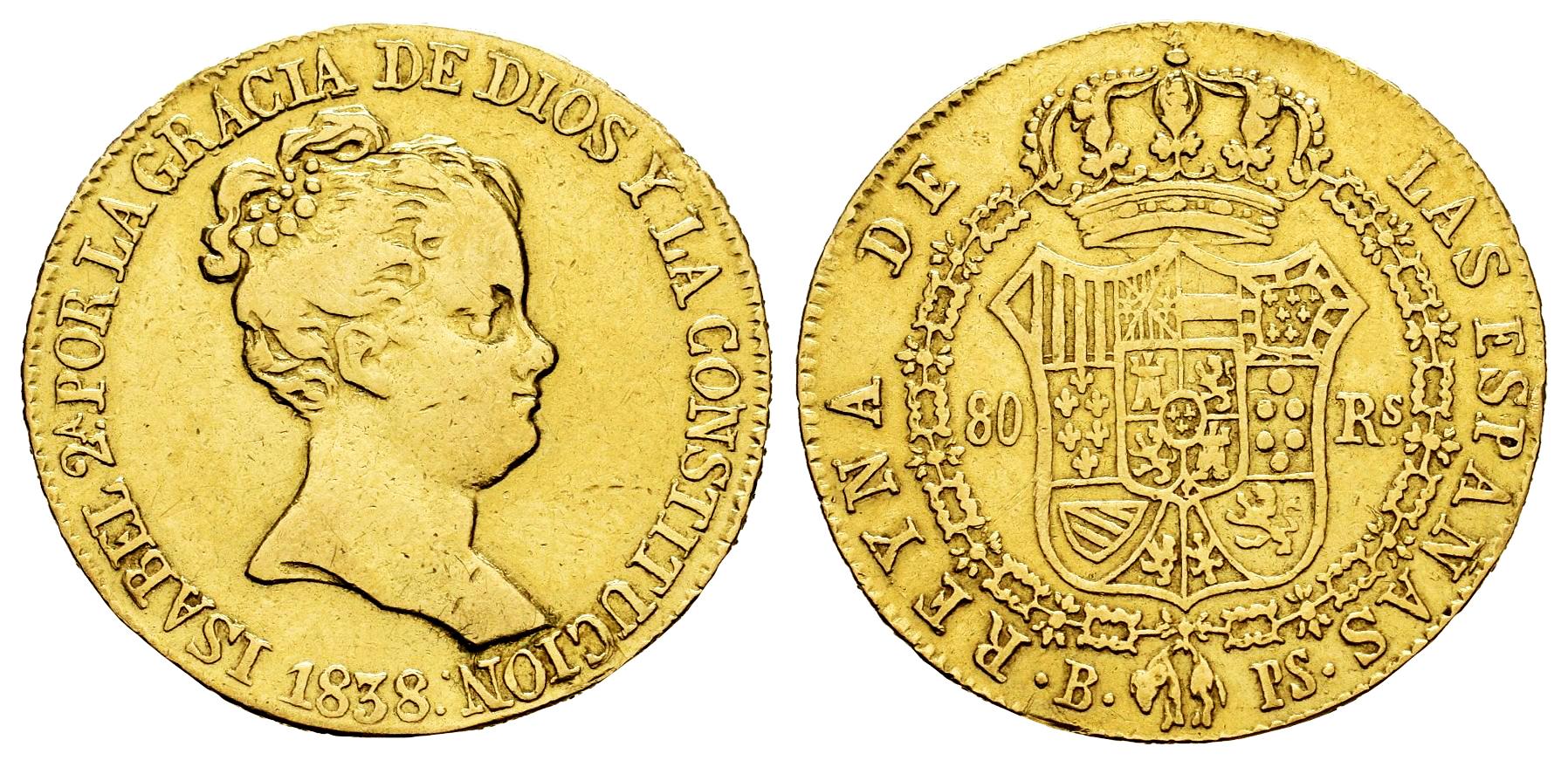 Isabel II (1833-1868). 80 reales. 1838. Barcelona. PS. (Cal-701). Au. 6,68 g. Leyenda CONSTITUCION. Golpecitos en el canto. Limpiada. MBC-. Est...600,00.