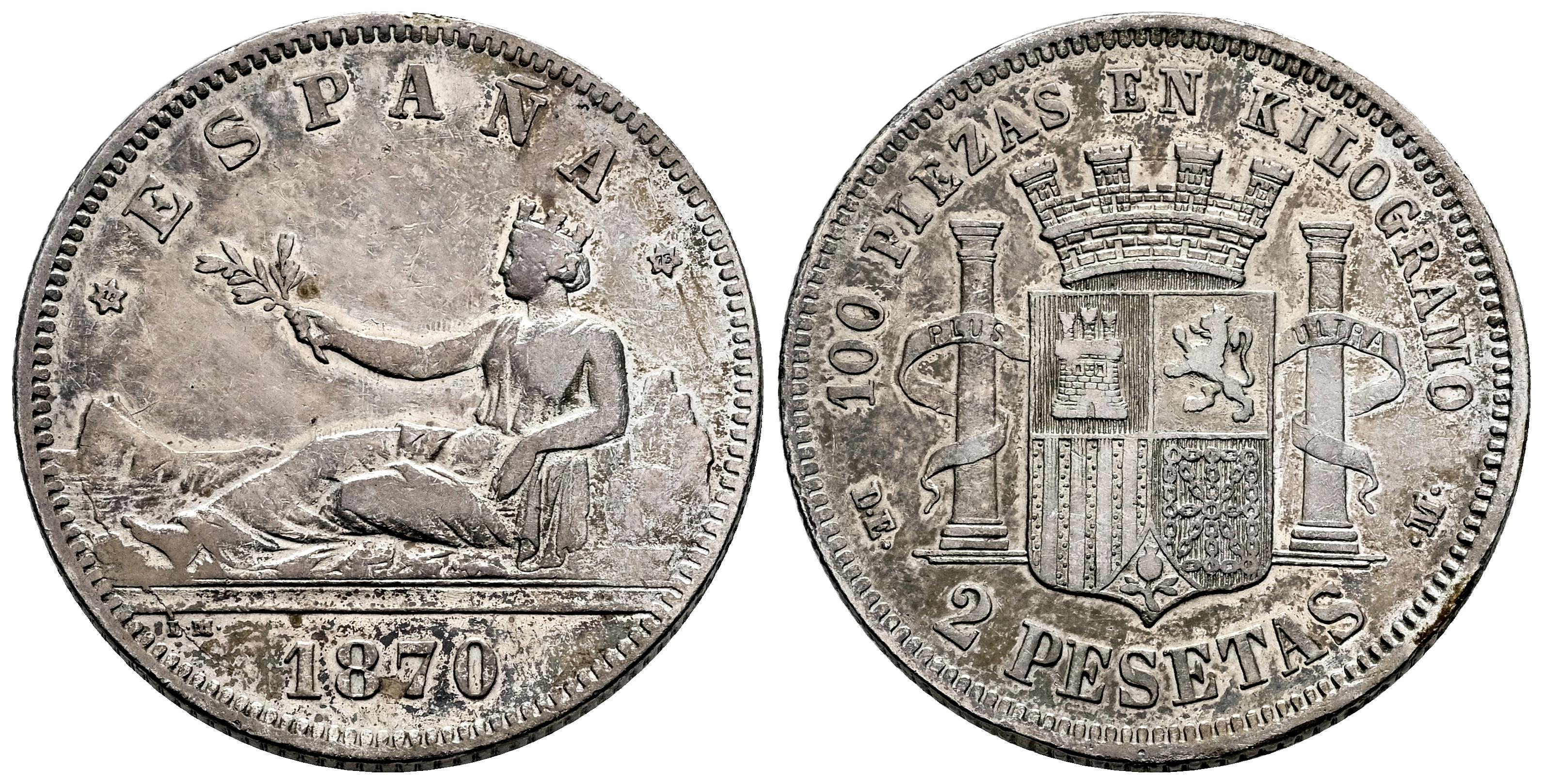 Centenario de la Peseta (1868-1931). Gobierno Provisional (1868-1871). 2 pesetas. 1870*18-73. Madrid. DEM. (Cal-28). Ag. 9,98 g. Rayitas. MBC-. Est...25,00.