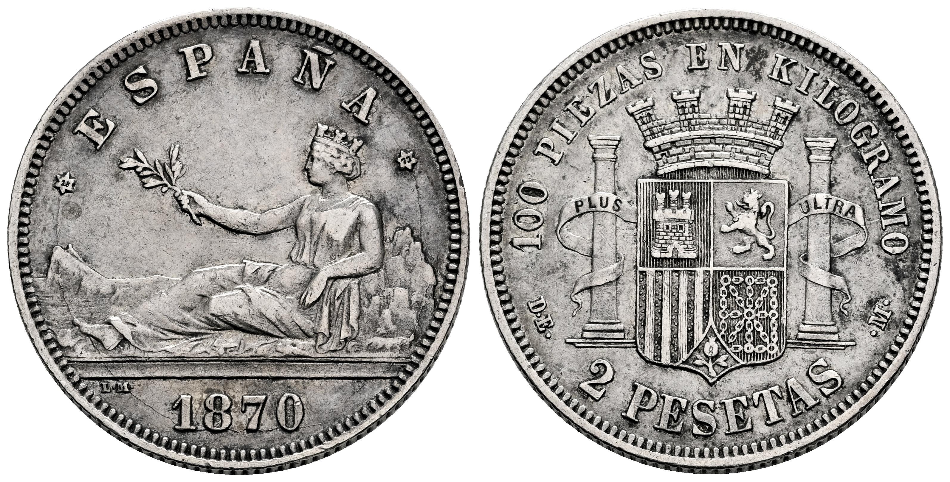 Centenario de la Peseta (1868-1931). Gobierno Provisional (1868-1871). 2 pesetas. 1870*18-73. Madrid. DEM. (Cal-28). Ag. 9,93 g. Limpiada. MBC/MBC+. Est...45,00.