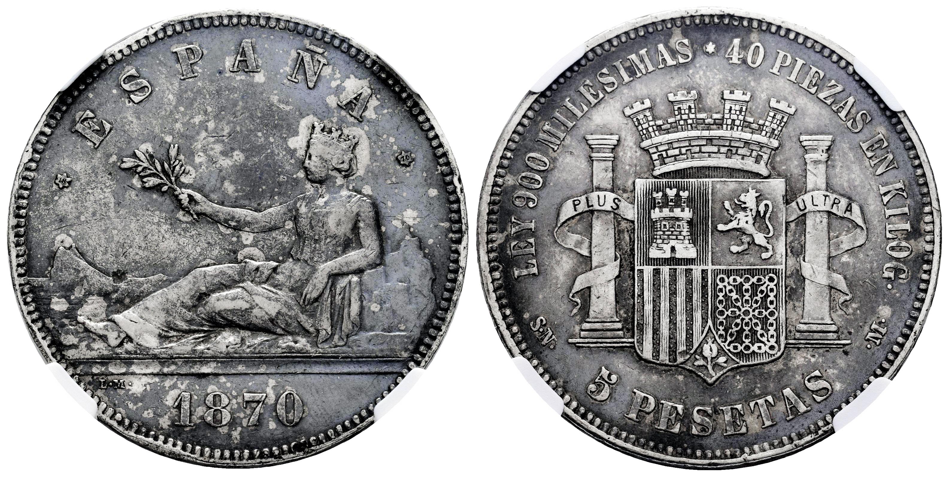 Centenario de la Peseta (1868-1931). Gobierno Provisional (1868-1871). 5 pesetas. 1870*18-70. Madrid. SNM. (Cal-39). Ag. Encapsulada por NGC como XF Details, cleaned. Est...60,00.
