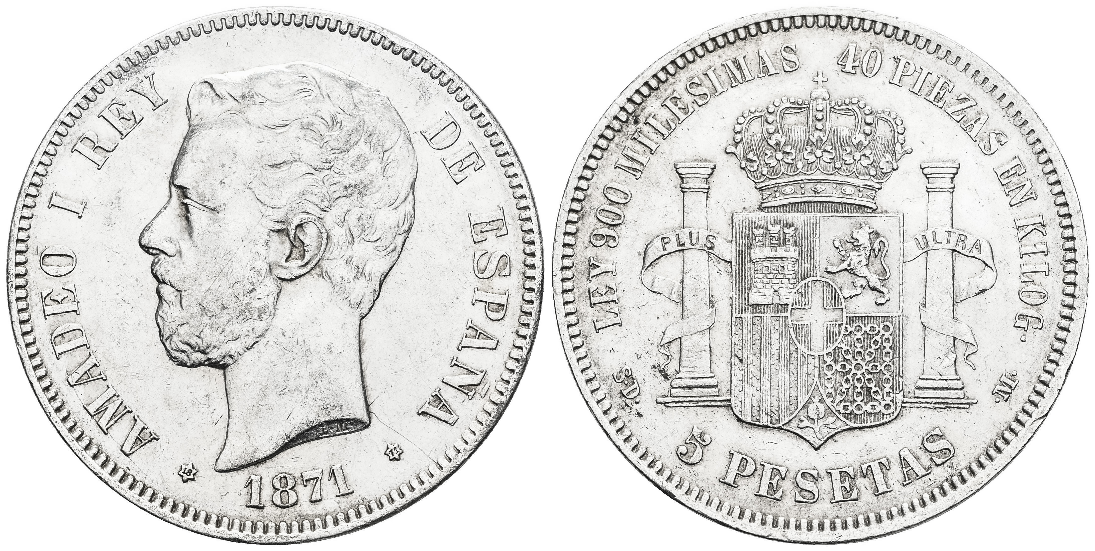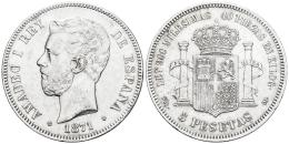 Centenario de la Peseta (1868-1931). Amadeo I (1871-1873). 5 pesetas. 1871*18-71. Madrid. SNM. (Cal-1). Ag. 24,74 g. Rayitas. Limpiada. MBC+. Est...35,00.